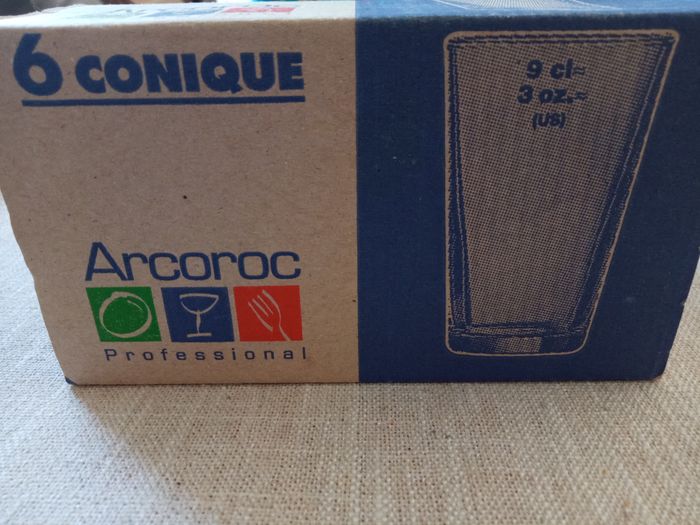 Ensemble de 6 petites Verrines "Arcoroc" Modèle: Conique Matière: en Verre Couleur: Transparent Dimensions: hauteur 6cm - Diamètre 4cm Contenance: 9cl (Marque professionnelle) Ensemble en parfait état, vendu comme sur les photos (Ni brèche, ni fêle)