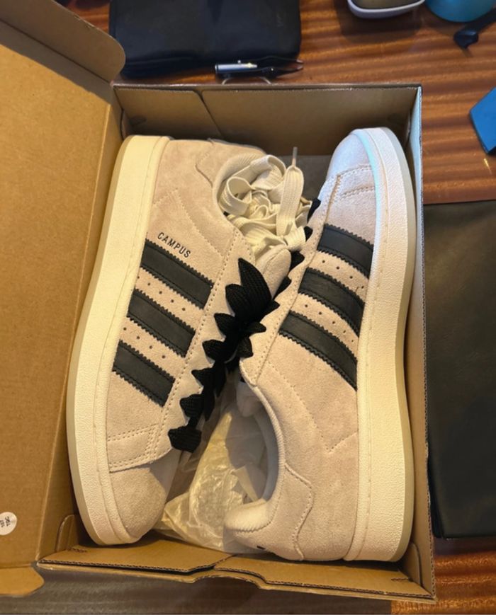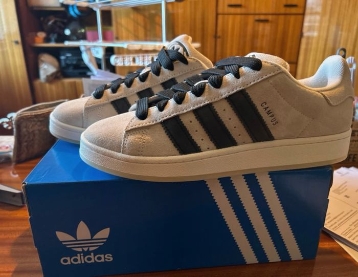 Neuves , jamais portées Campus taille 45 1/3 Grises idéal cadeau de Noël car vendues dans la boite d’origine avec des lacets de rechange Achetées 120 € il y a 2 mois Modèle campus grises 00s