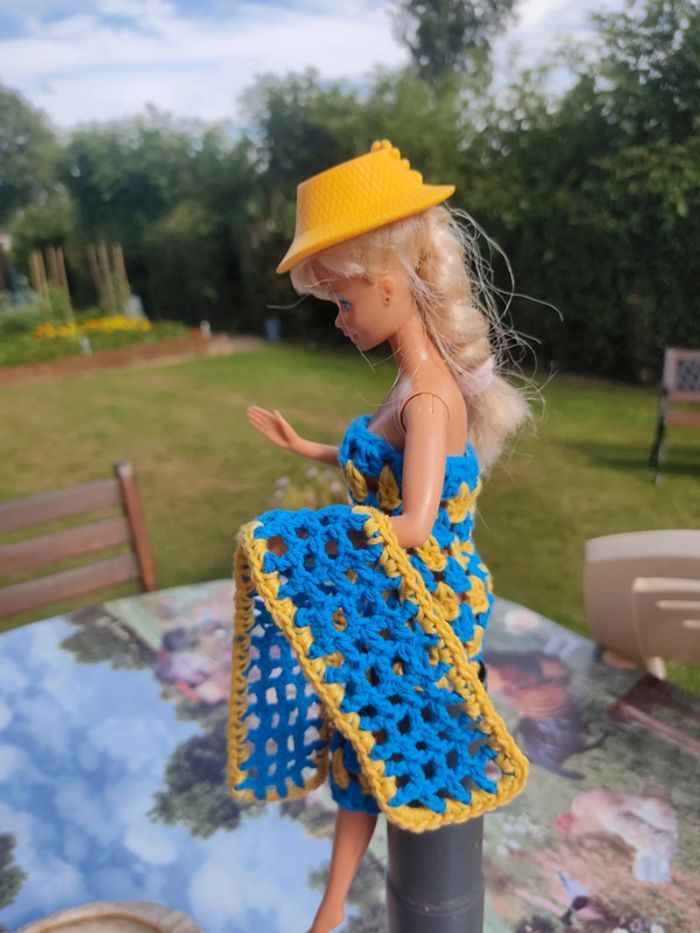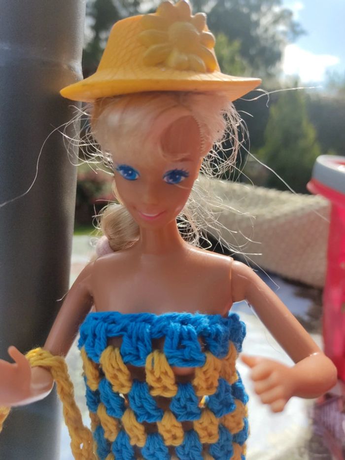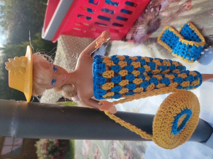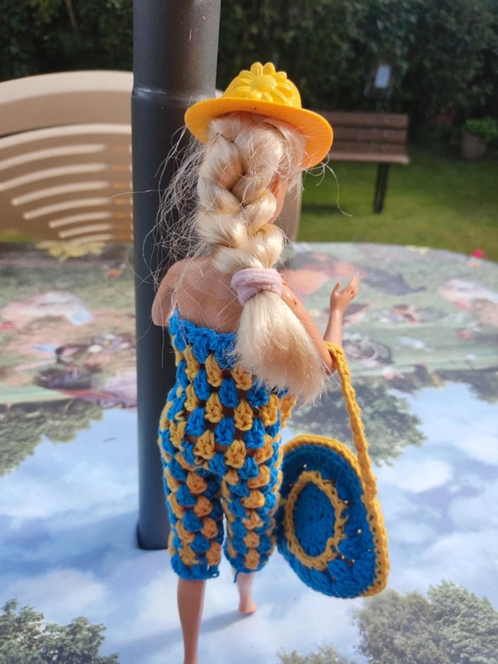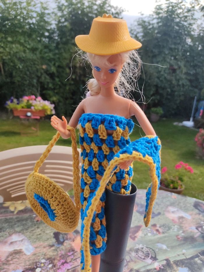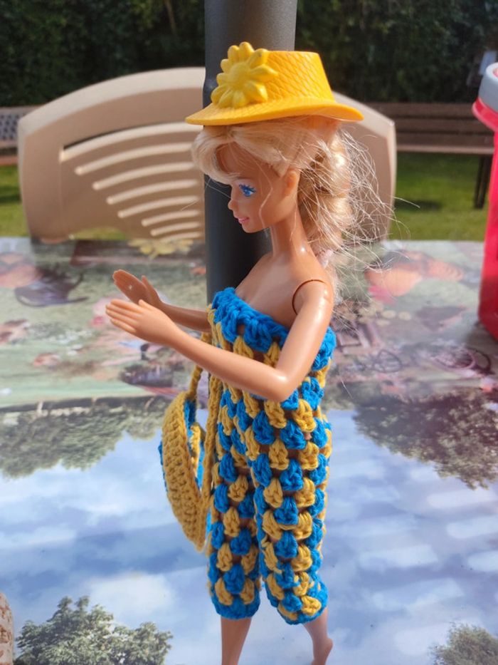 Barbie habillé :combi pantacourt, châle, chapeau, sac à main. Fait main par moi cette Barbie n'est pas à vendre.