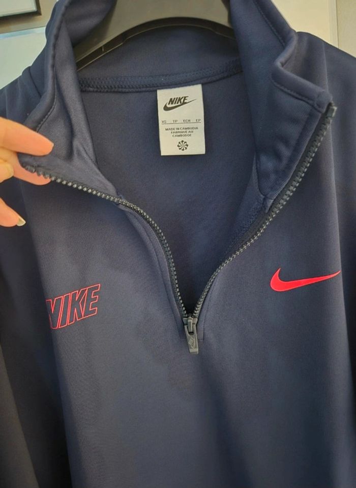 Sweat Nike Zip à l encolure Bleu marine logos rouges Bandes blanches et logos rouges sur les manches Poche ventrale Taille XS Très peu porté en parfait état #virginie2220homme #virginie2220hommetaillexs