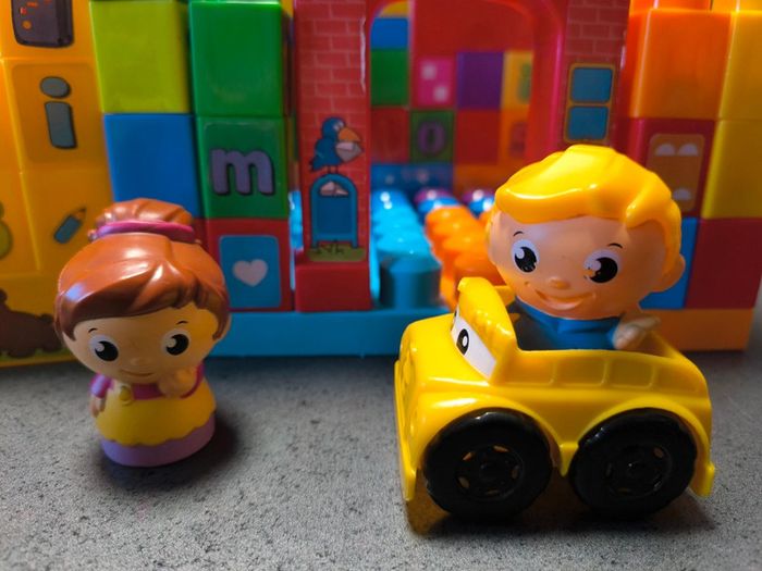 Jeu de construction méga block école et train avec 2 personnages