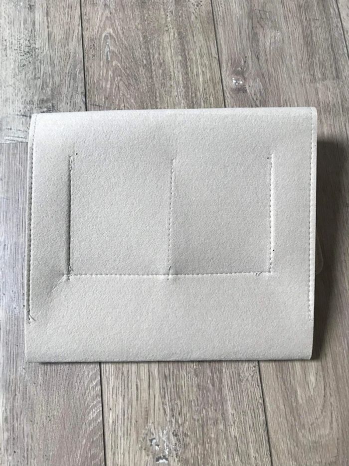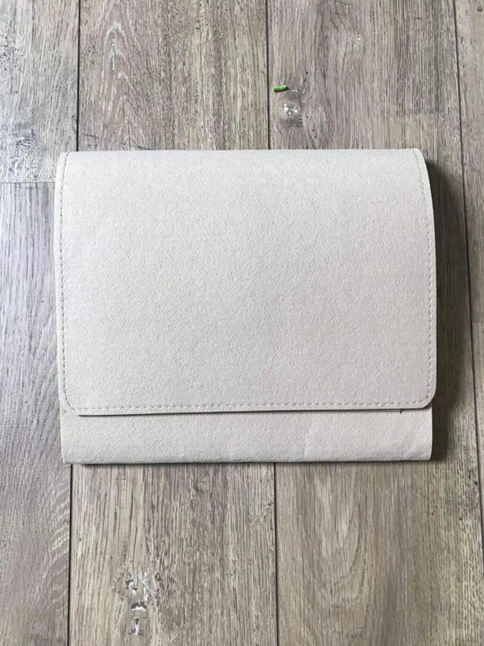Pochette beige en suedine neuve. Dimensions : longueur 30cm x hauteur 27cm.