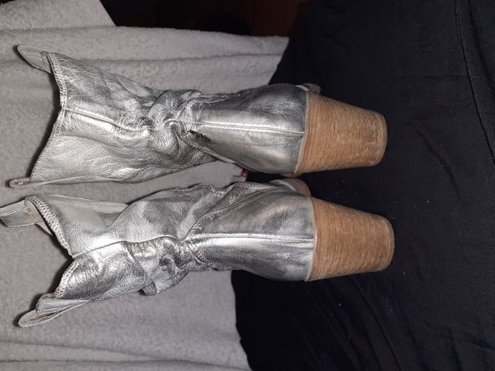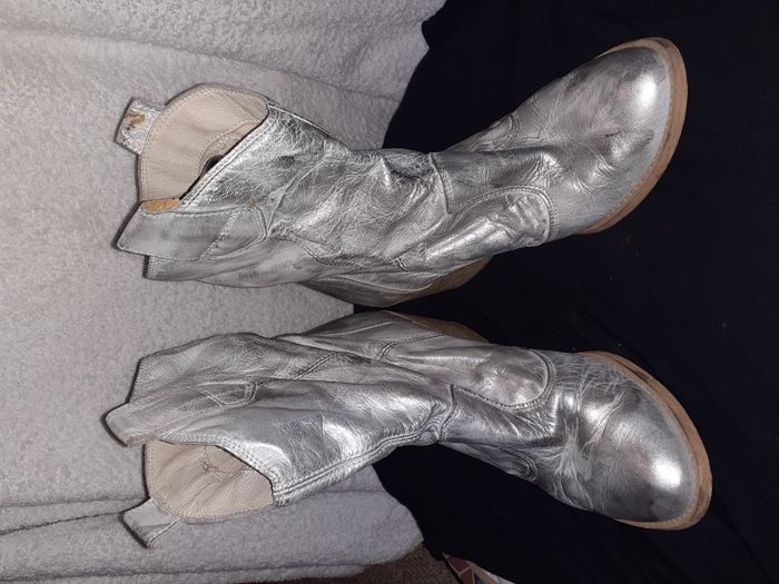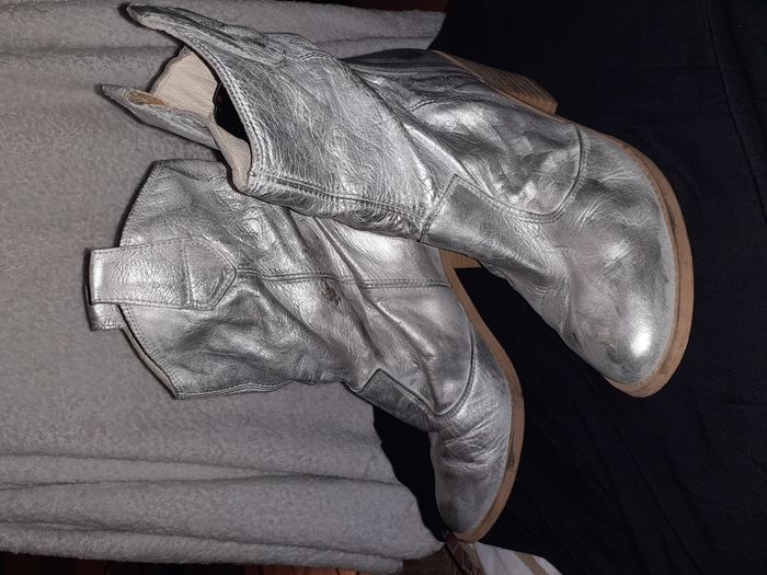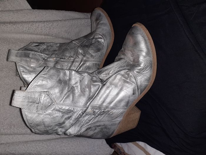 Bottines western argentées, idéales pour un look tendance et original. Taille 39. Elles ont été portées, donc présentent quelques marques d'usure (voir photos). Le cuir argenté leur donne un aspect unique. Talon bois 6 cm