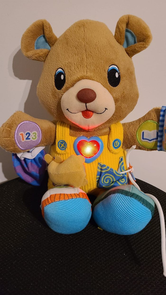 Gaspard 1,2,3 habille-moi est un adorable ourson de Vtech qui accompagne bébé au quotidien. Il lui fait découvrir les formes, couleurs, émotions et lui apprend à s'habiller. Bébé peut appuyer sur sa main droite pour chanter, danser et frapper des mains avec Gaspard. Un bouton sur le pied gauche permet de découvrir les couleurs et les différentes parties du corps. Un bouton sur le pied droit déclenche des chansons et des mélodies amusantes (15 mélodies et 4 chansons). Le gros bouton lumineux en forme de coeur permet lui d'entendre les battements de coeur de Gaspard. Trop mignon ! il y a un petit ourson dans une des poches !