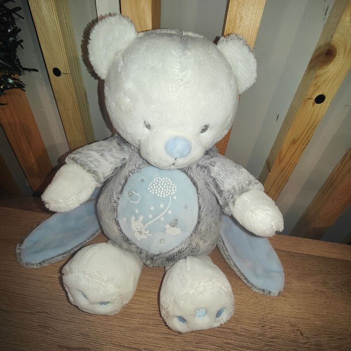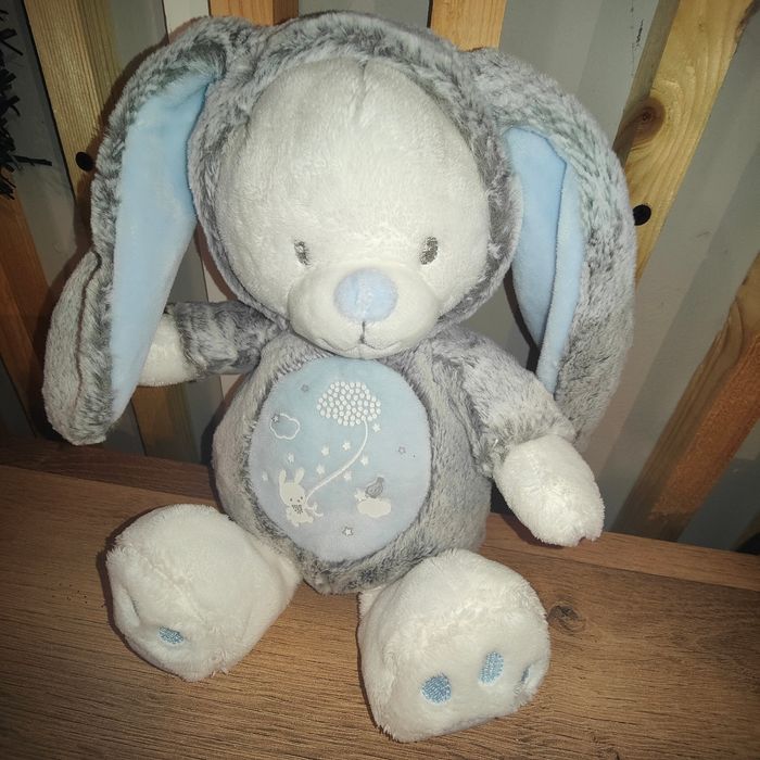 Peluche ours MOTS D'ENFANTS déguisé en lapin boule bleu gris nuages étoiles Leclerc 26 cm Excellent état tout doux 18 euros Envoi en relais