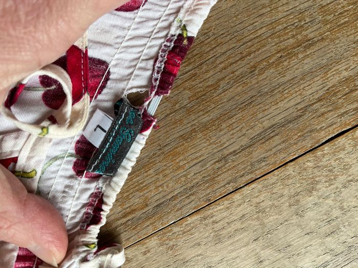 Robe d'été blanche avec motifs cerises. Très bon état, sauf petit accroc au niveau de l'élastique dans le dos (ne se voit pas lorsque portée car élastique non tendu)