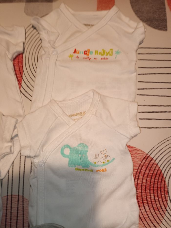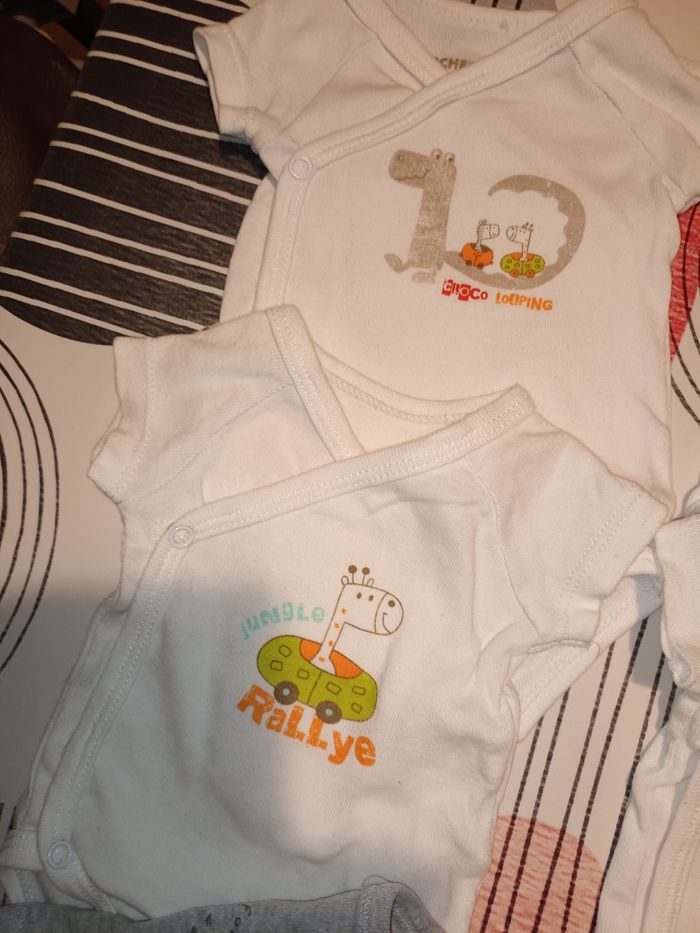 Lot 4 bodies manches courtes et 1 manches longues qui s'ouvrent devant Taille : naissance Marque : Kiabi eg Orchestra État : très bon état, 2 ont les dessins qui s'effacent #manaissancegarsemilie #manaissancefilleemilie
