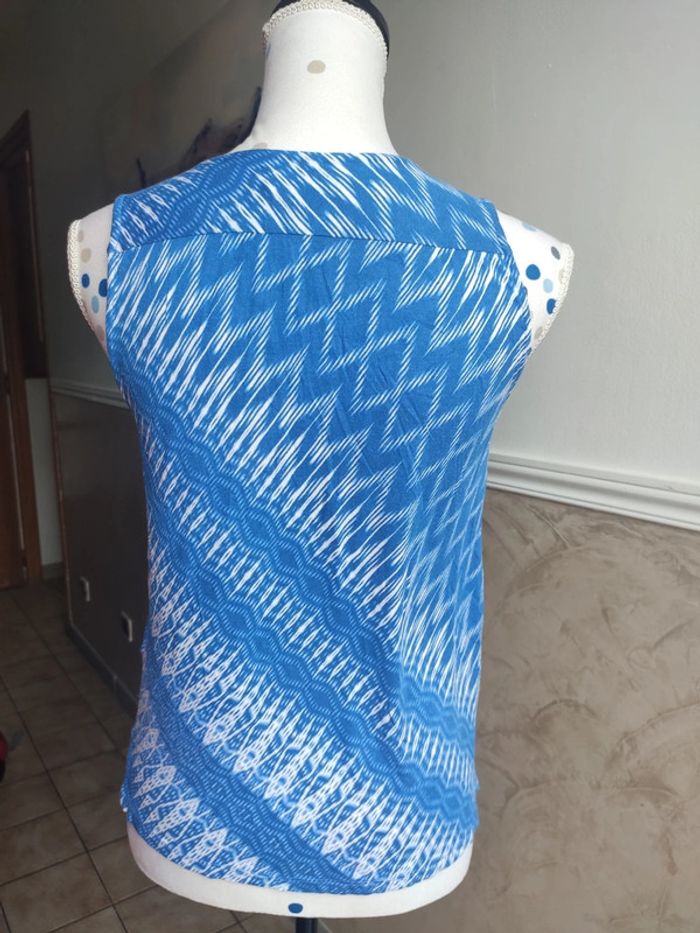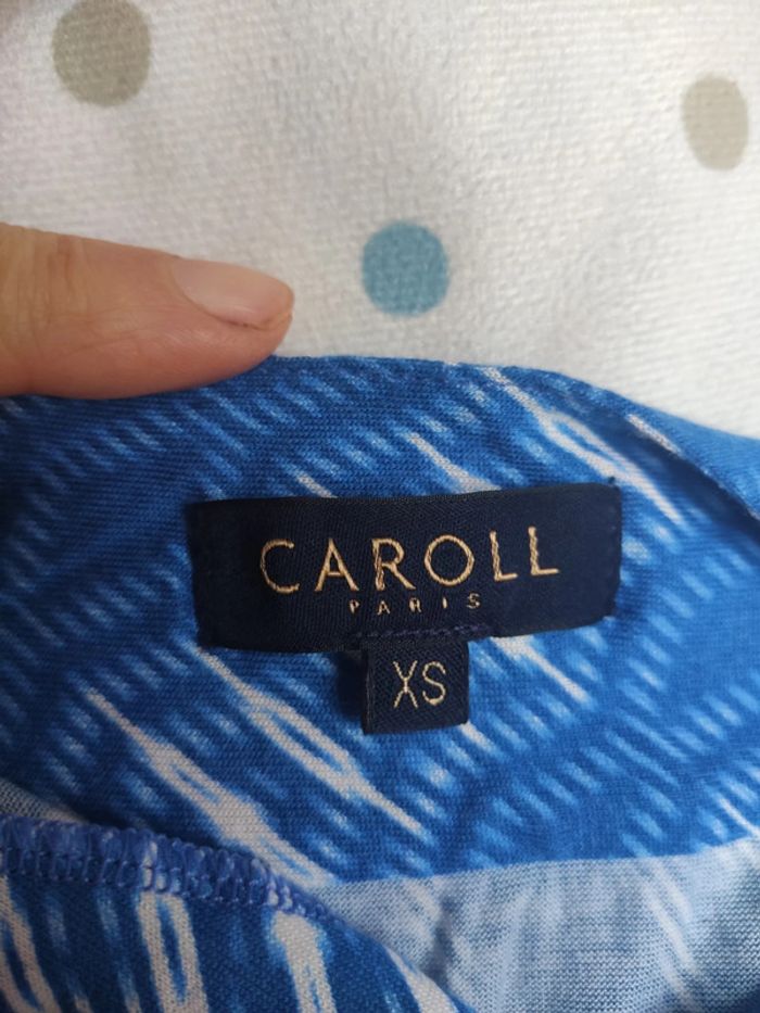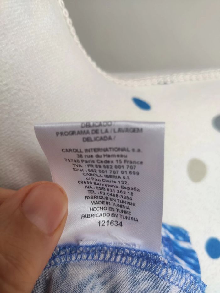 Peu porté, noté taille XS mais peut aussi convenir à un 36 voire 36/38 car tissu fluide et un peu extensible Couleurs : bleu et blanc Très agréable à porter
