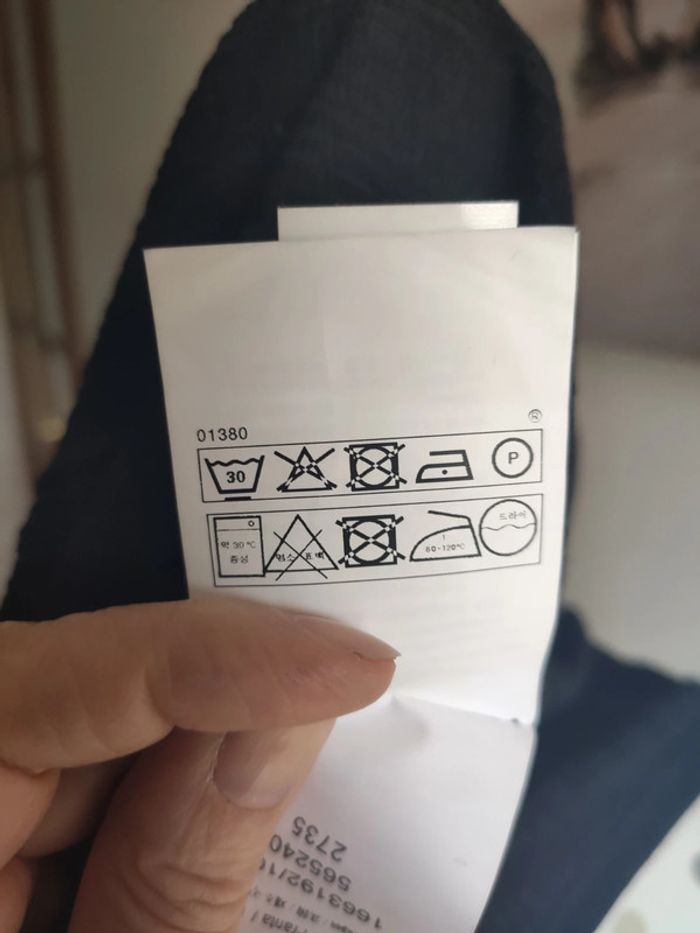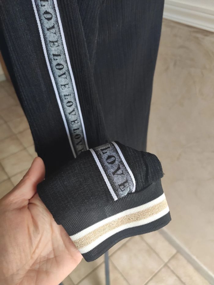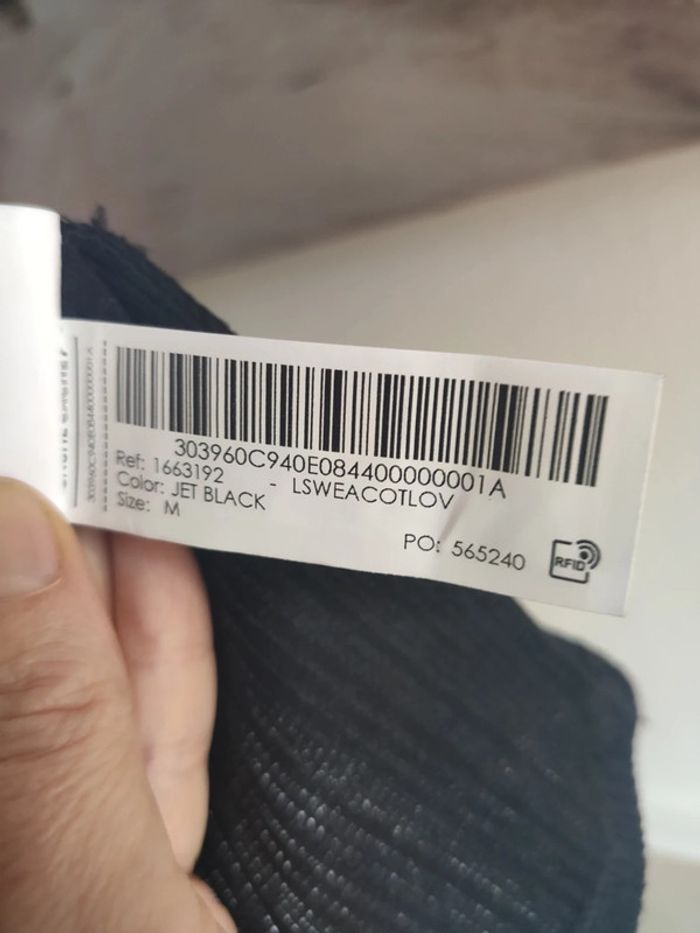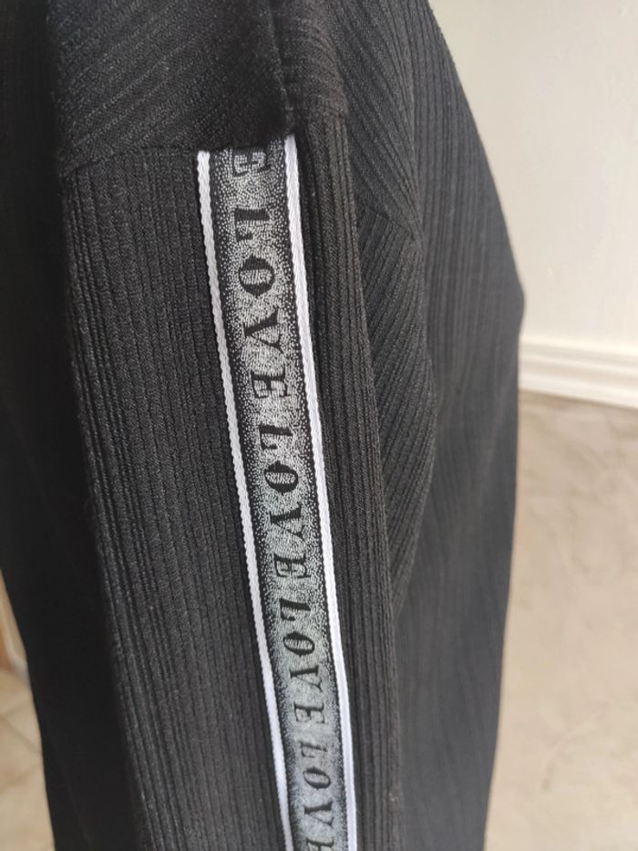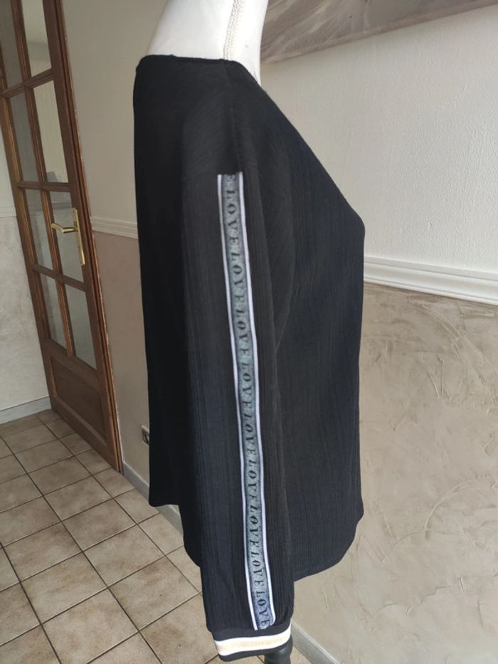 Jamais porté, article neuf, taille M ( pour un 38/40 ou 40) Joli tissu noir avec bandes rubans inscription "love" sur les manches. Bords côtes blanc/noir/or au niveau des poignets