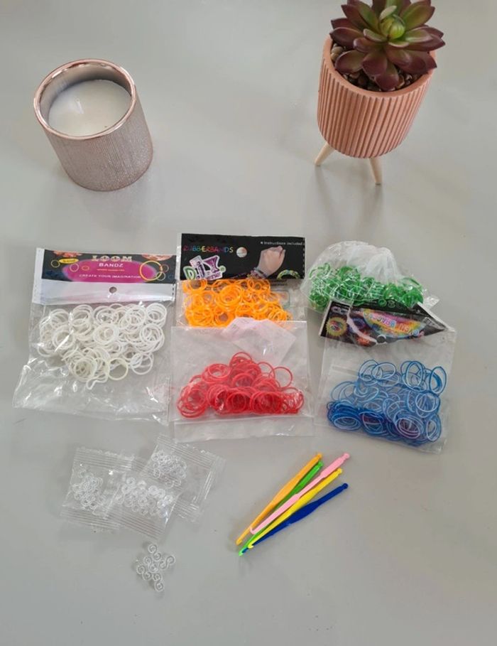 Lot d élastiques à bracelets Blanc, rouge, orange, bleu, vert Il y a également des crochets fermoirs Ainsi que 5 pics pour la fabrication Tous les sachets ont été ouverts et ne sont pas complets #virginie2220bijoux #virginie2220jeu