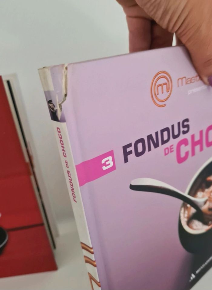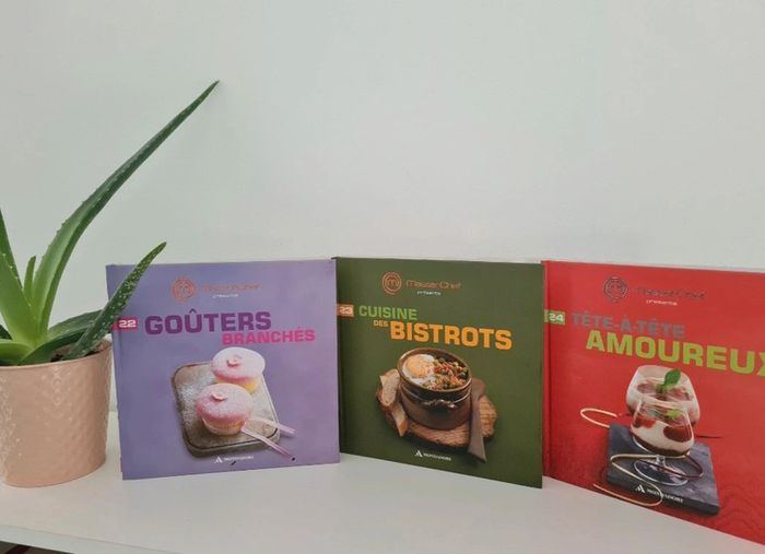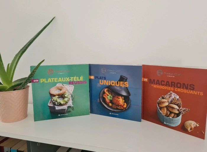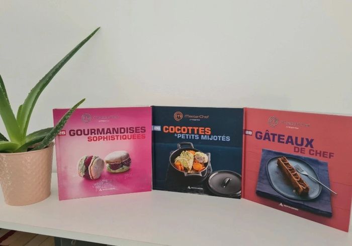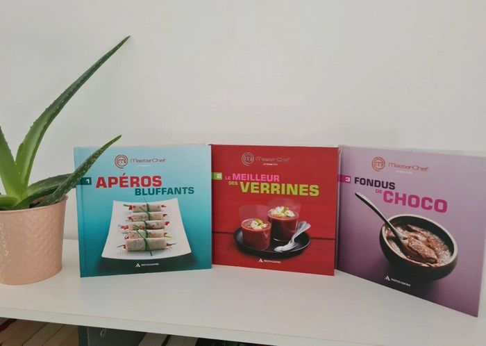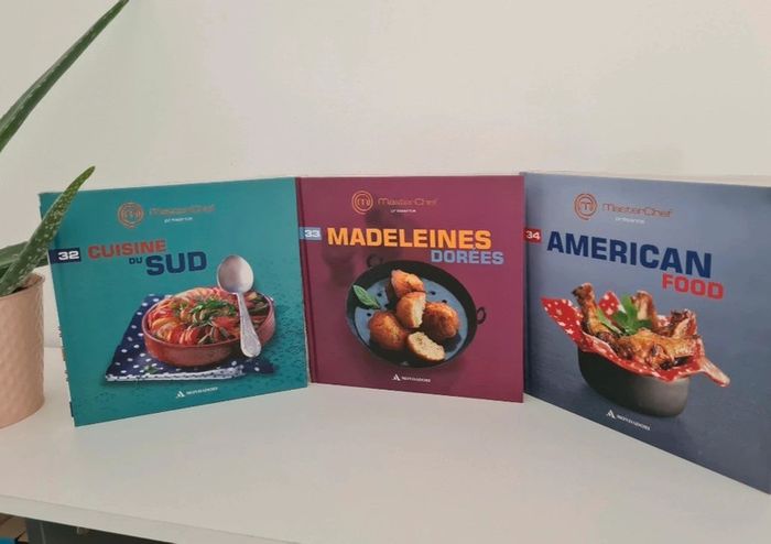 Livres de cuisine Masterchef 3.50 € l unité 6€ les 2 7.50€ les 3 20€ les 10 50€ les 33 - Aperos bluffants - Le meilleur des verrines - Fondus de choco - Little Italy - Simple et bon à moins de 5€ - Petites douceurs - Cuisine d automne - Cakes Tartes et cie - Desserts mania - Cuisine vite fait, bien fait - Les traditionnels - Woks et poêlées gourmandes - Tartes & cakes en folie - Petits Gratins & crumbles - Cuisine d'hiver - Soupes tendance - Recettes festives - Saveurs de la mer - Cuisine du monde - Crèmes et mousses fondantes - Saveurs et minceurs - Goûters branchés - Cuisine des bistrots - Tête à tête amoureux - Gourmandises sophistiquées - Cocottes et petits mijotés - Gâteaux de chef - Plateaux télé réussis - Plats uniques - Macarons & whoopies croquants - Cuisine du sud - Madeleines dorées - American food Ils sont en très bon état. Seulement la tranche du volume 3 est abîmée voir photo J ai d'autres livres dans mon dressing n'hésitez à composer des lots pour limiter les frais de port 👉 #virginie2220livres