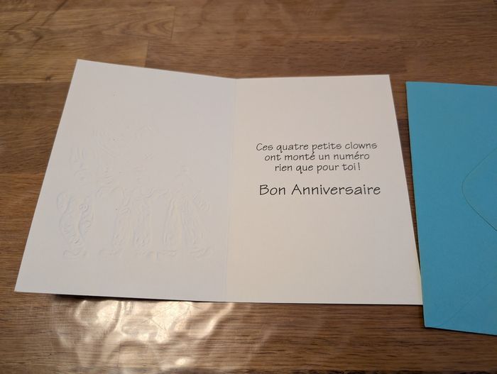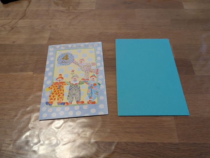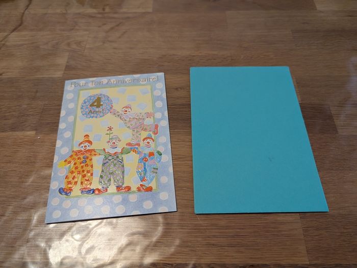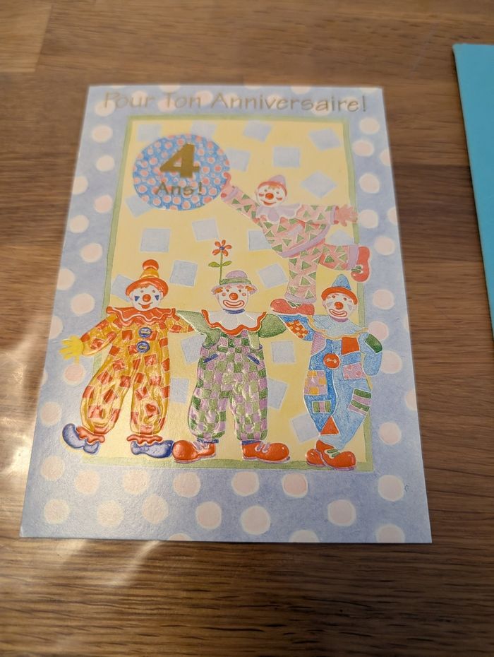Carte d'anniversaire 4 ans Neuf mais il y a une tâche sur le devant de l'enveloppe.