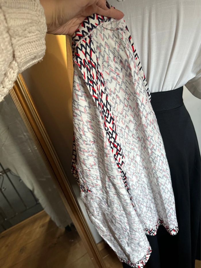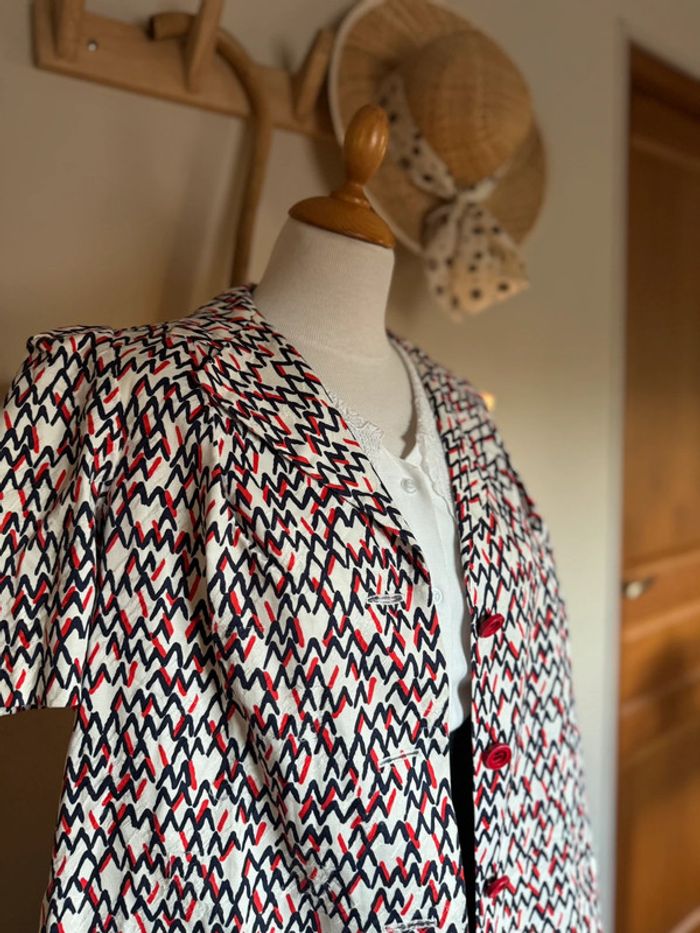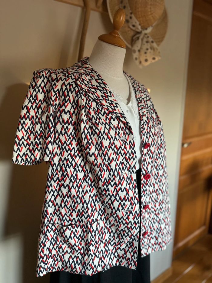 Bonjour,voici mon dressing! 👐🏻 Veste Blazer Légère Blanche avec Motifs Noir et Rouge Manches Courtes Faite Main Taille 40 En coton Très belle coupe et qualité Conditions : 💫 Envois de préférence avec Mondial Relay ✖️ Toute demande avec Relais Colis sera refusée ✖️ Pas d’échange 💫 Chouchou fait main, recyclé, aux coloris aléatoires offert dès 30€ d'achat Bon shopping ! 🛍