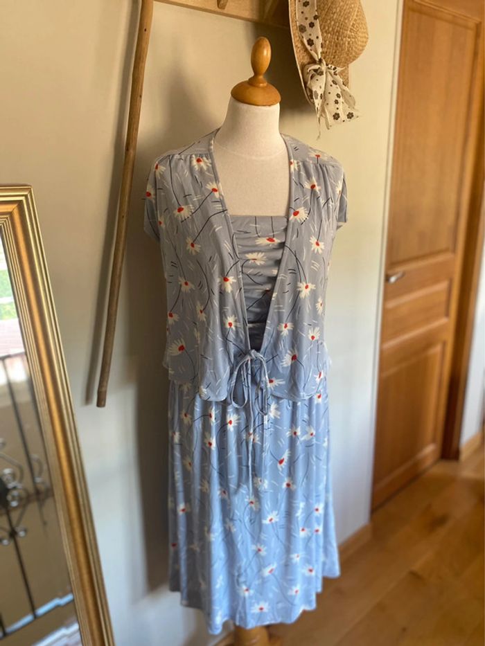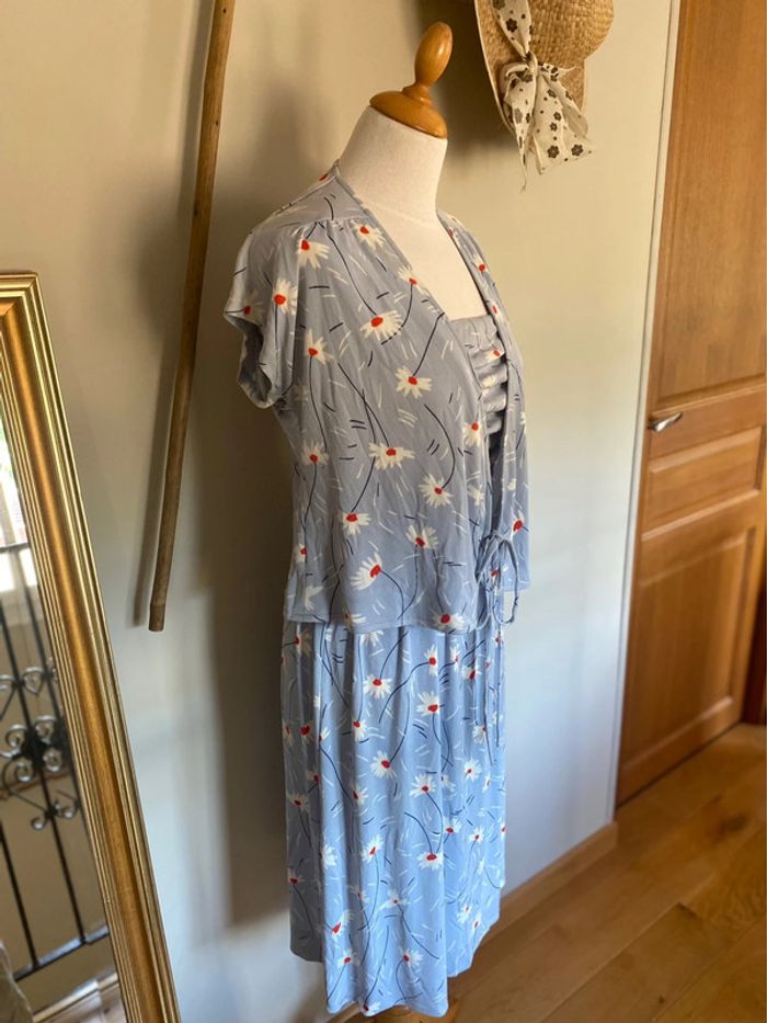 Robe Légère avec Boléro Bleu à Fleurs Blanches Vintage Années 80 - photo numéro 2