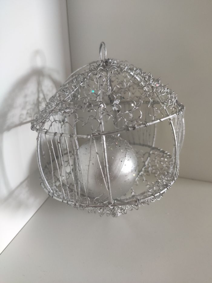 10 cm de largeur, une poule argentée à paillettes dans une grosse boule en métal avec un fil de suspension. Très bon état