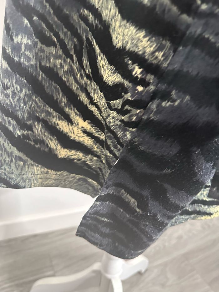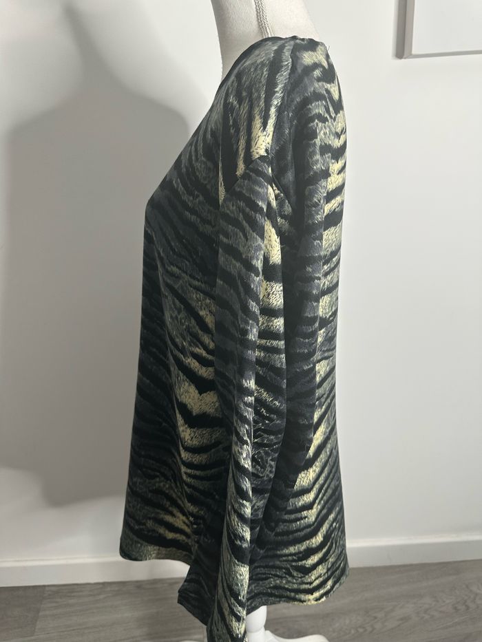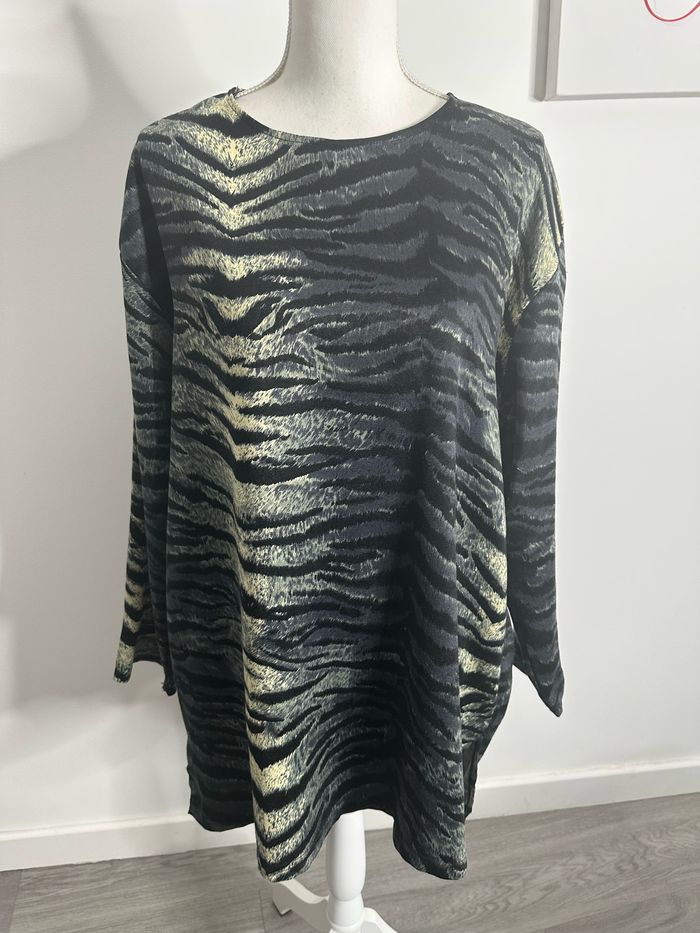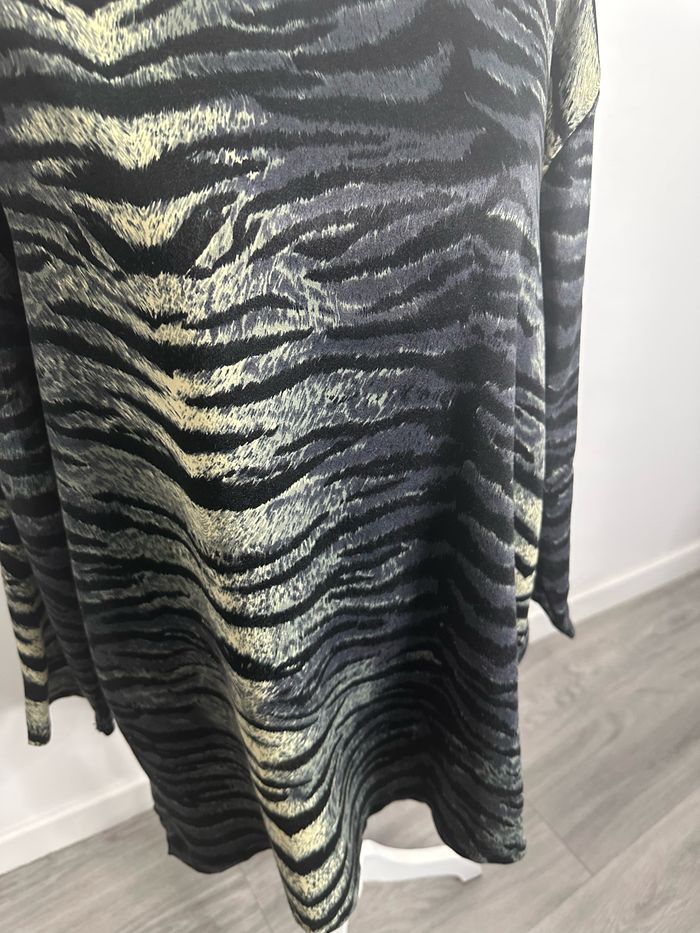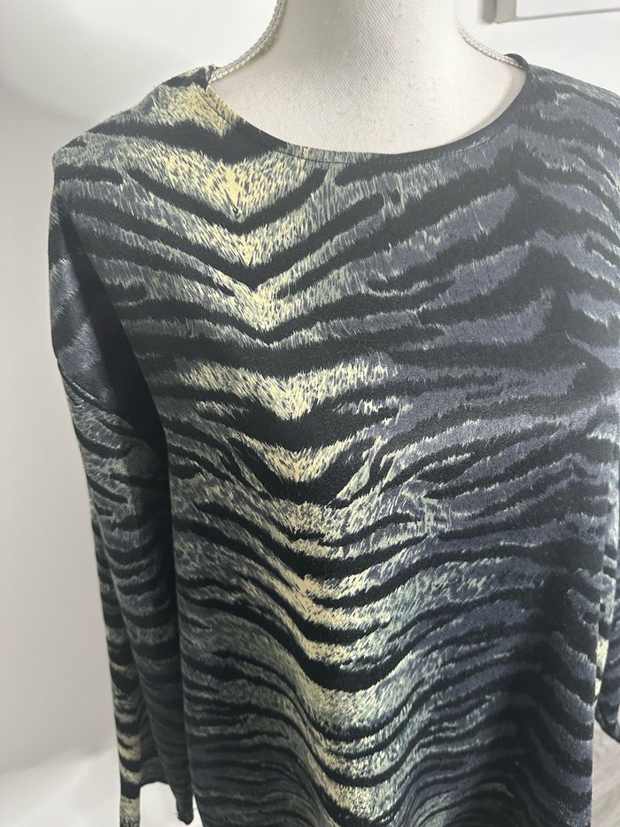 Pull fin - Excellent état - Taille 46/48 équivalent 3XL/4XL - Imprimés zèbre - Jaune, noir et gris - Légèrement fendu sur les côtés - Fabrication française 🇫🇷 - Vintage, années 80’ - Touché velours - 100% polyester Dimensions: - 64cm niveau aisselles - 78cm de long