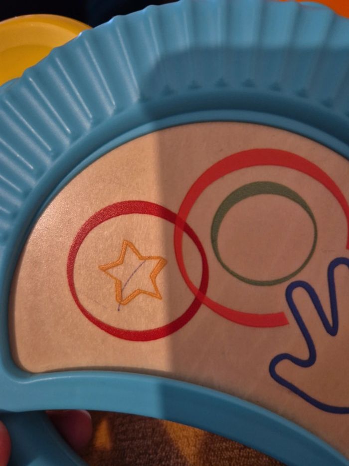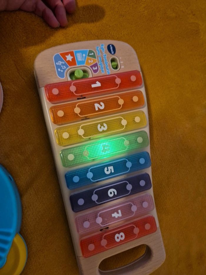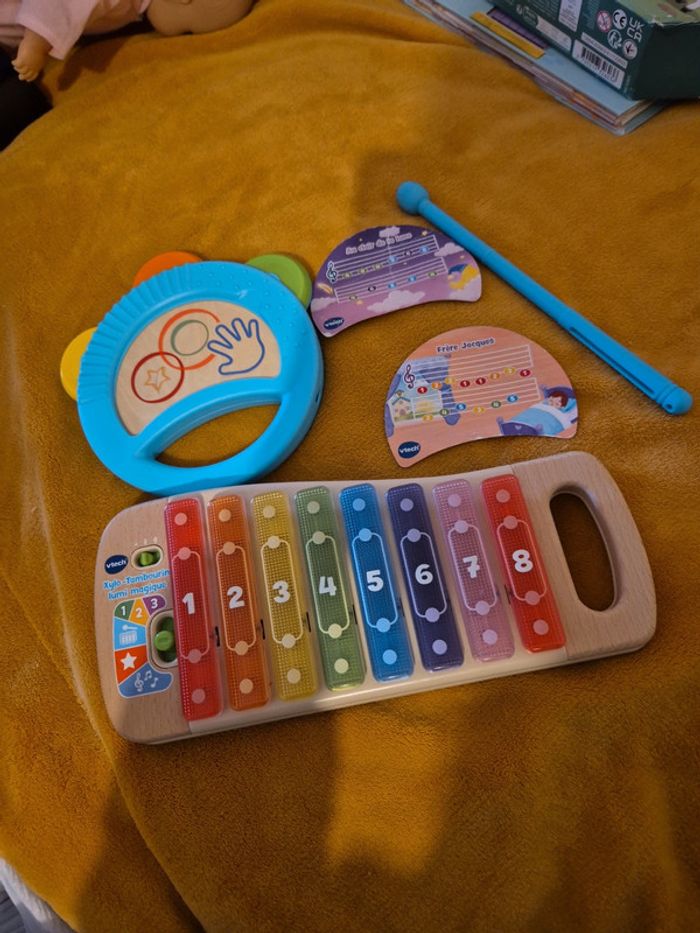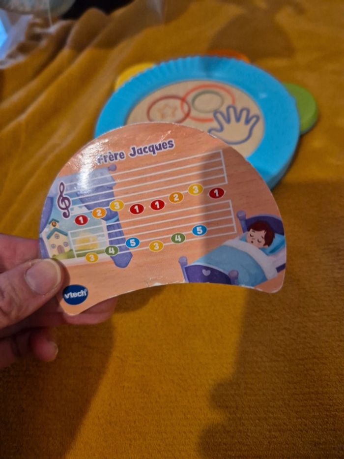 En très bon état hormis les petites cartes abîmées (fonctionnent quand même) et une trace de crayon sur le tambourin