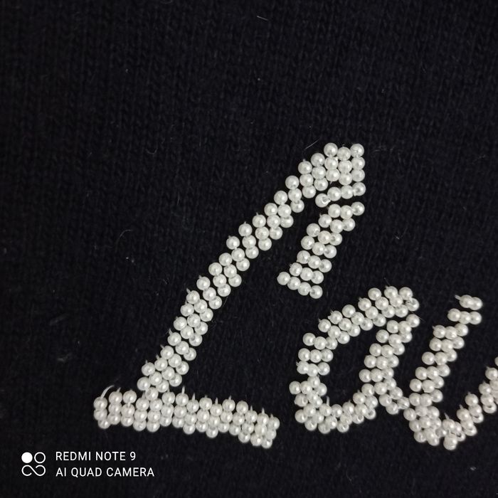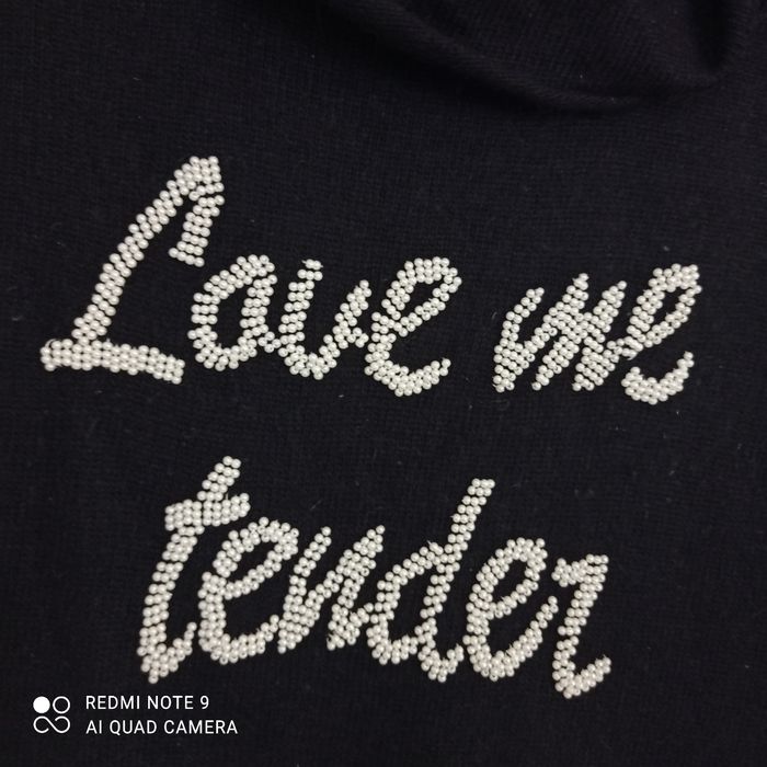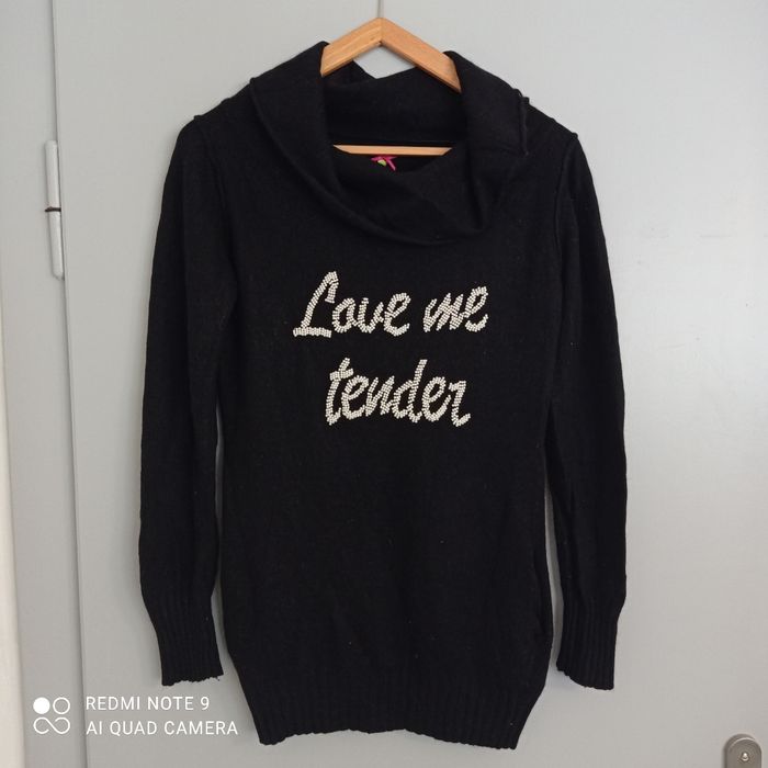 Col roulé. Quelques bouloches. Composition voir étiquette en photo. Inscription love me tender en perles. Assez long : 70 cm. Épaules: 42 cm .