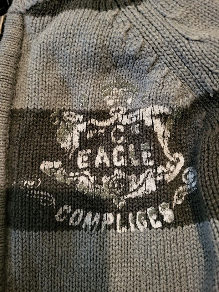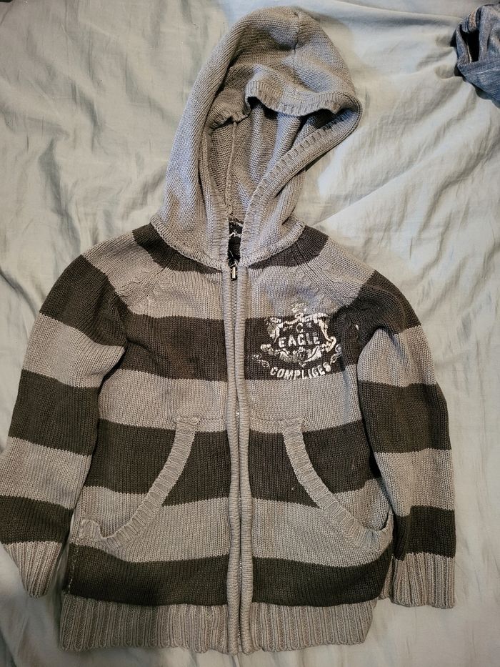 Veste grise Complices 4/5 ans Dessin dvt qui s'abîme. Et fermeture éclair qui perd de sa peinture. Léger petit trou sous la capuche Sinon en bon état
