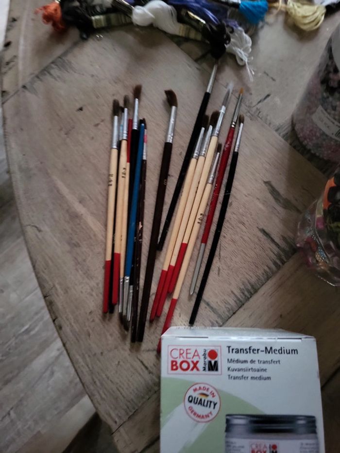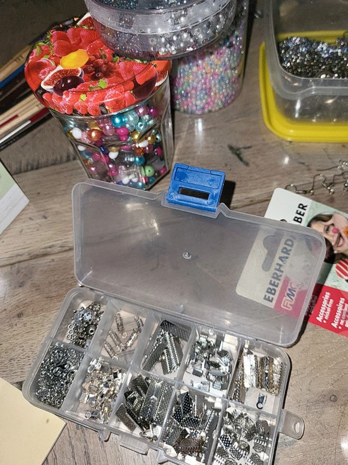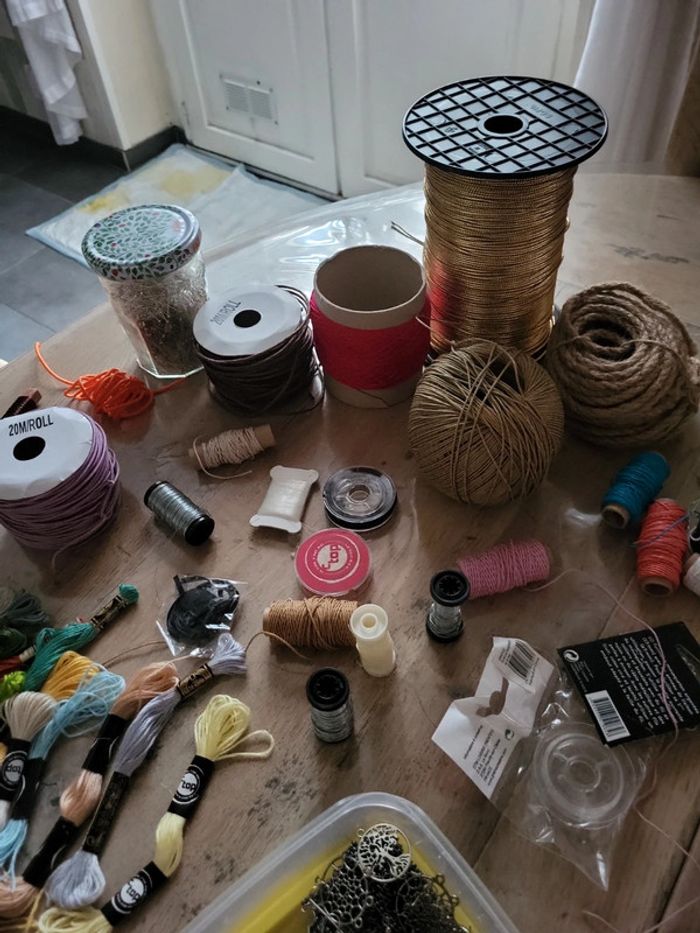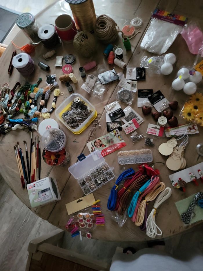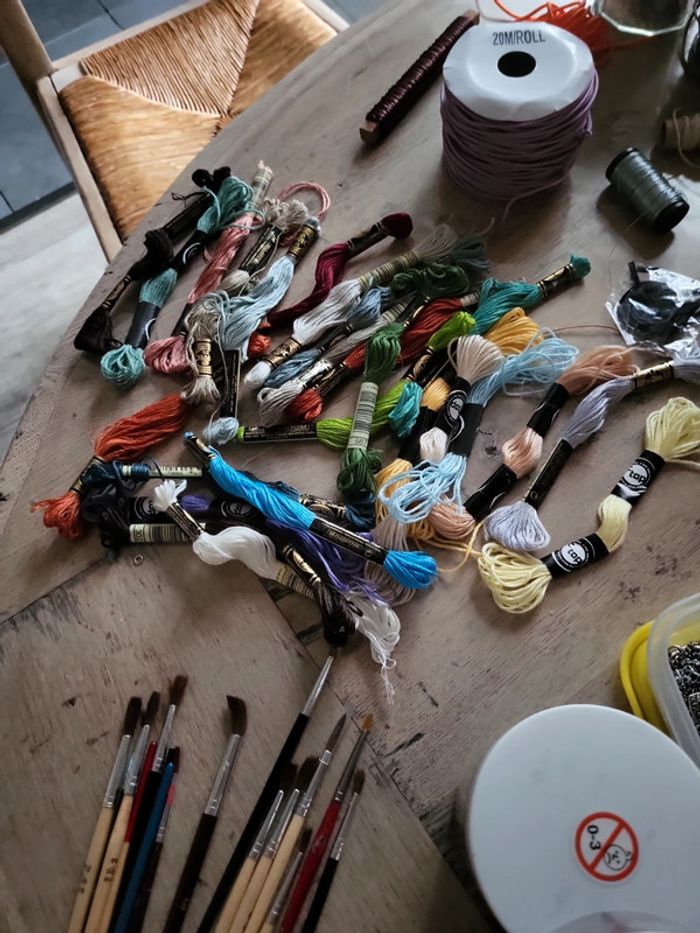Perles, fil de fer, anneaux toutes les tailles, fil canevas , fermoirs, pinceaux etc...