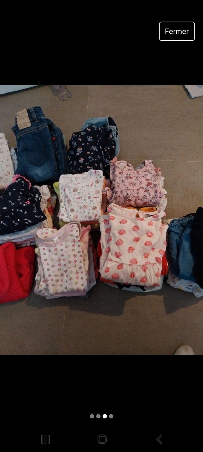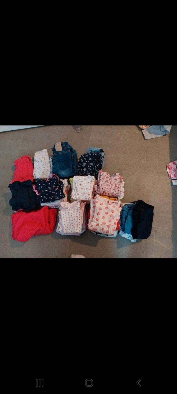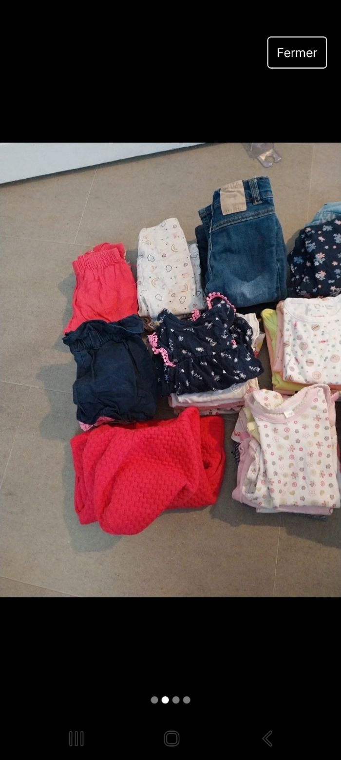 1 gilet 2 shorts 1 jupe 2 pantalons léger 6 débardeurs 7 tee shirt manches courtes 5 tee shirt manches longues 8 robes 5 combinaisons 5 bodies 2 salopettes 4 pantalons 5 leggings Tout en très bon état