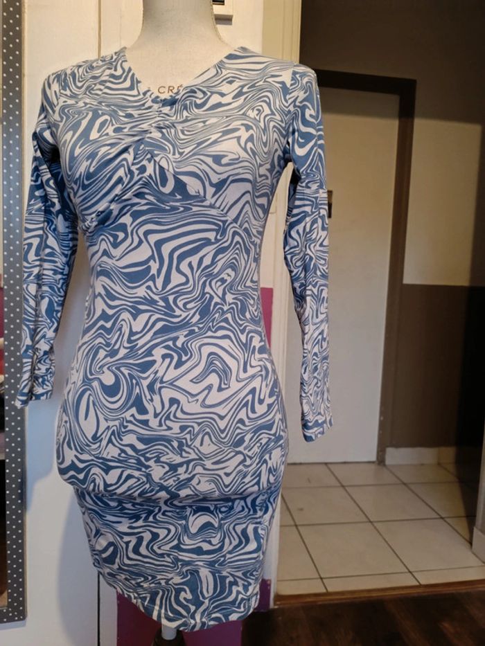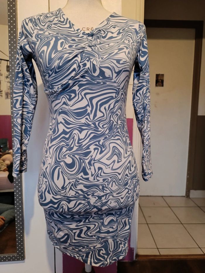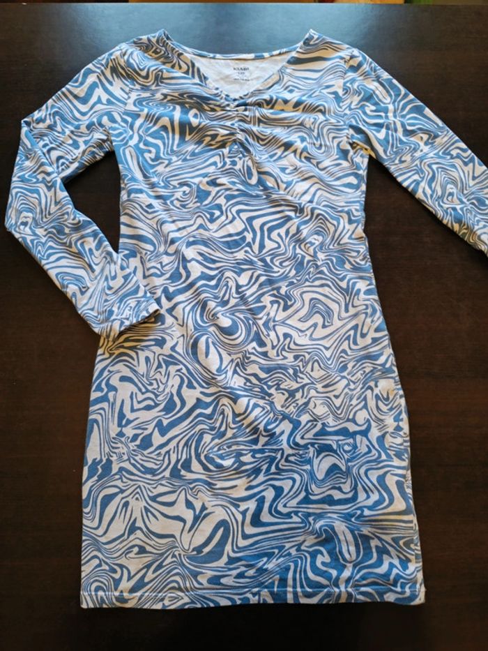 Robe KIABI Bleue & blanche Manches longues Décolleté V 96% Coton & 4% Elasthanne TAILLE XXS TRES BON ETAT Allez voir mes autres ventes!