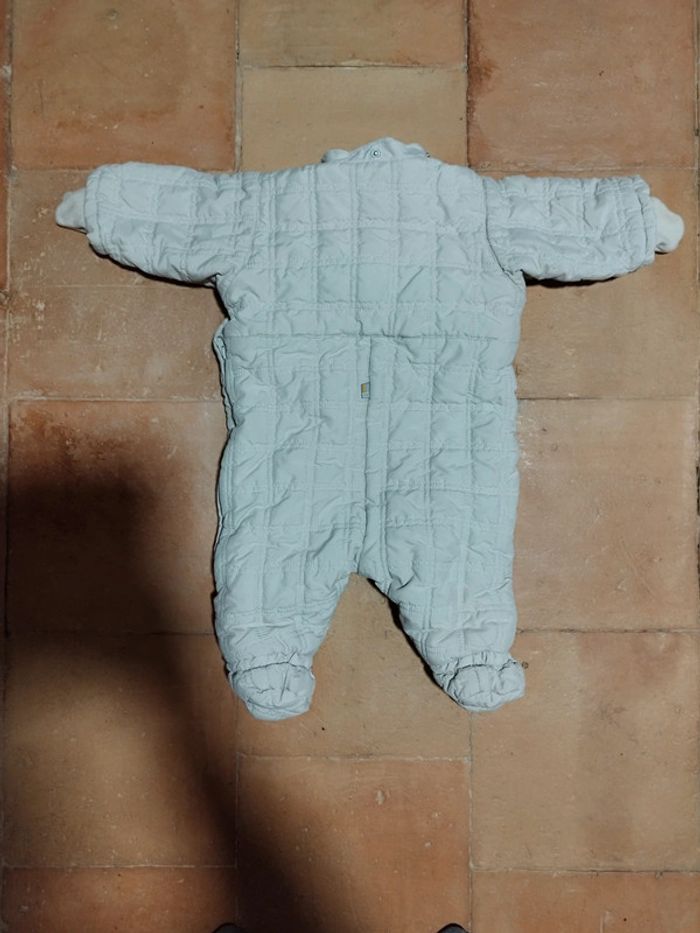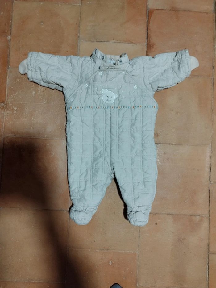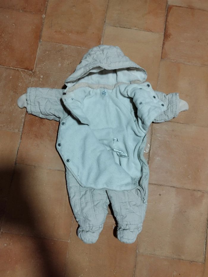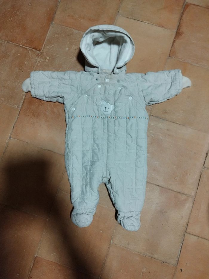 Combinaison vert-d'eau, taille 6 mois, très bon état, molletonnée. Mains et pieds protégés. Capuche amovible