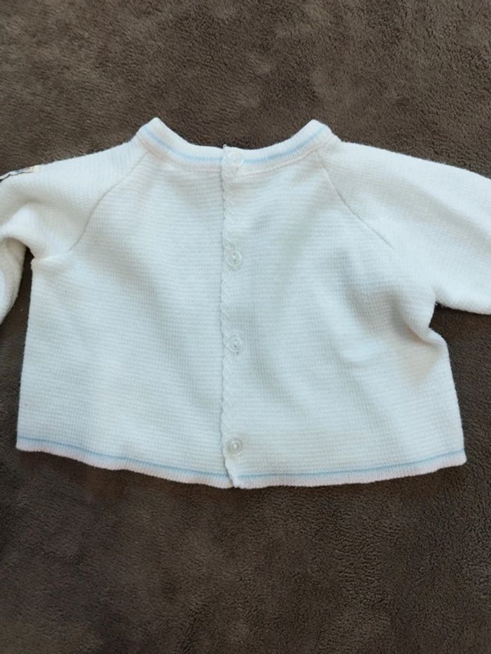 Lot comprenant 1 pull mauve et 1 gilet fin blanc à liseré rose et bleu, taille 3 mois Très bon état