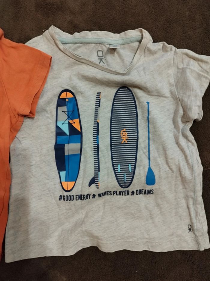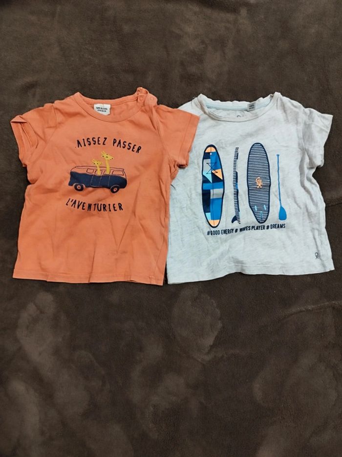 Lot de 2 tee-shirt taille 2 ans,marques Okaïdi et Tape à l'oeil. Très bon état, sauf le orange où il manque une lettre au niveau des écritures