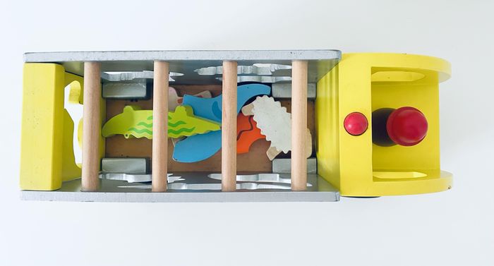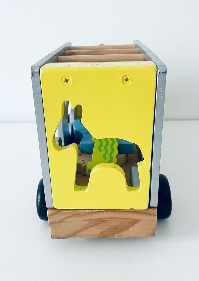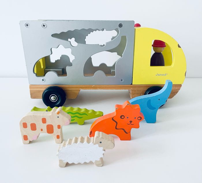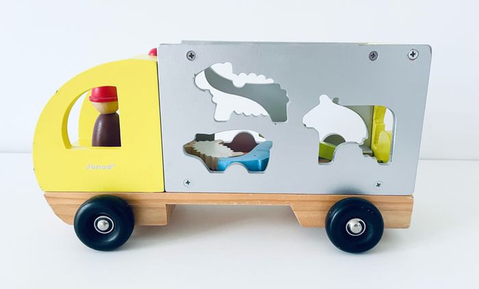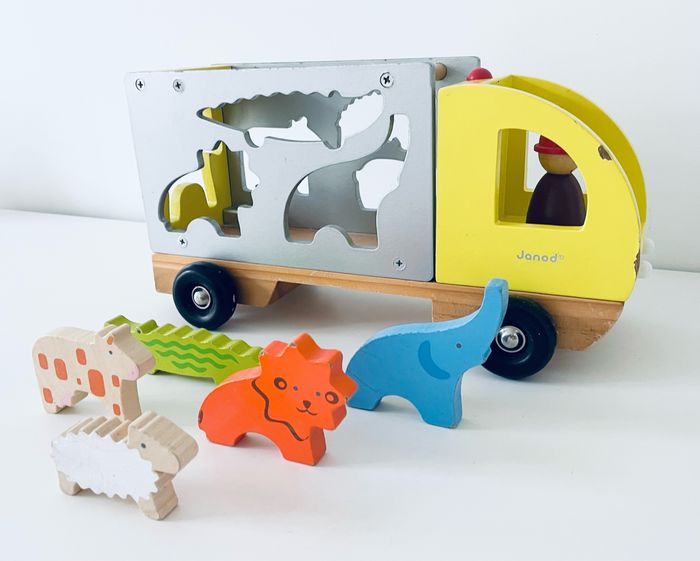 Magnifique camion à forme tout en bois de la marque Janod Très bon état car nous avions laissé ce jouet chez les grands-parents parents pendant le Covid donc très peu utilis