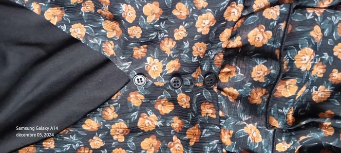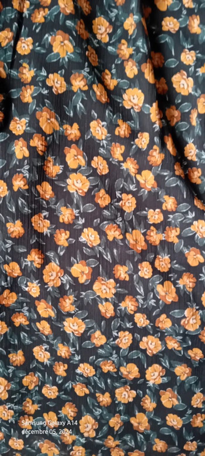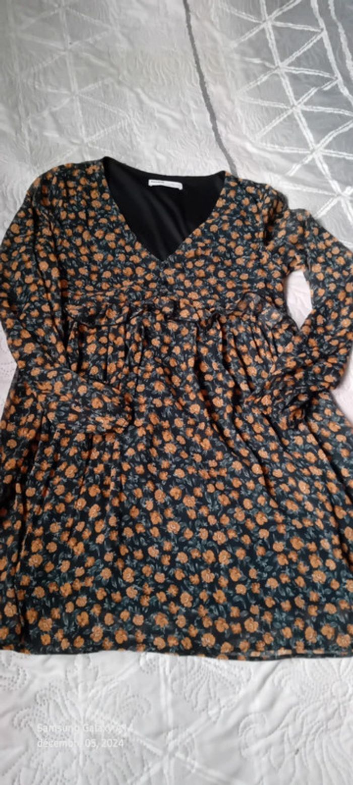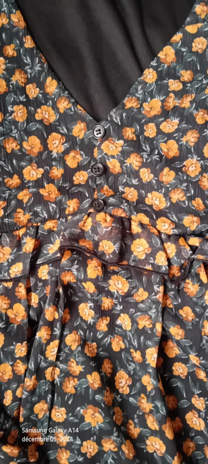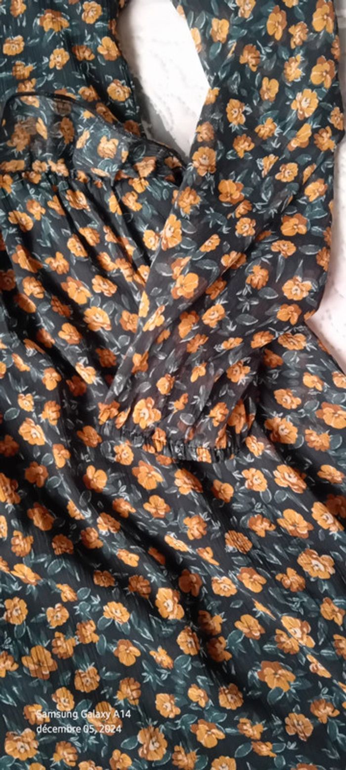 Robe manches longues mi longue en polyester aspect voile doublé décolleté en V avec boutons petit volant à la taille motif fleurs jaunes sur fond noir élastique aux manches longueur 81 cm largeur aisselles à aisselles 44 cm largeur épaules 32 cm longueur manches 55 cm taille S 36 juste porté une ou deux fois en très bon état #midole #midolefemme #midolefemme36 #robefemme36 #robemotiffloral #robepull&bear