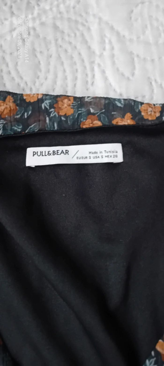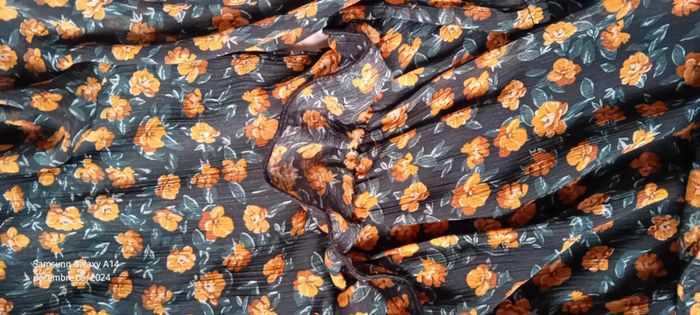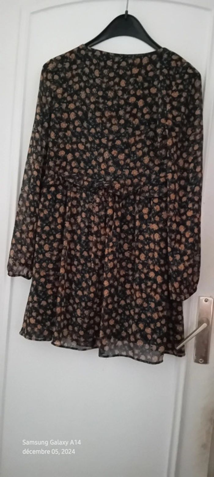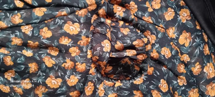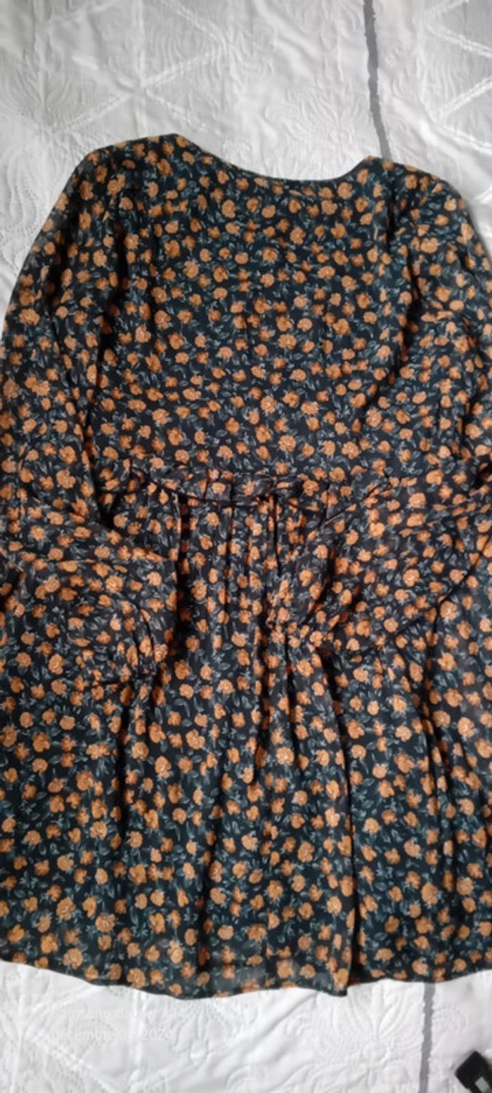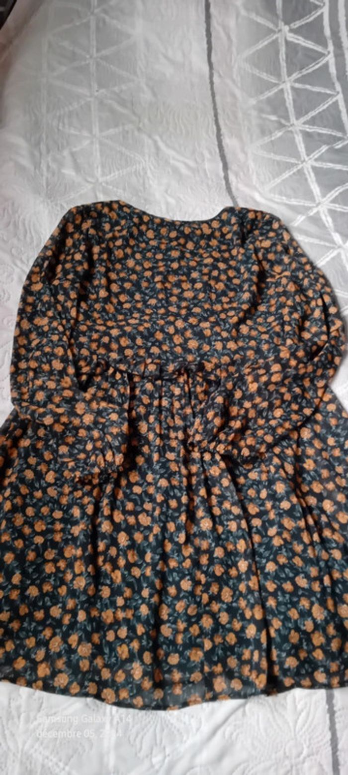 Robe manches longues mi longue en polyester aspect voile doublé décolleté en V avec boutons petit volant à la taille motif fleurs jaunes sur fond noir élastique aux manches longueur 81 cm largeur aisselles à aisselles 44 cm largeur épaules 32 cm longueur manches 55 cm taille S 36 juste porté une ou deux fois en très bon état #midole #midolefemme #midolefemme36 #robefemme36 #robemotiffloral #robepull&bear