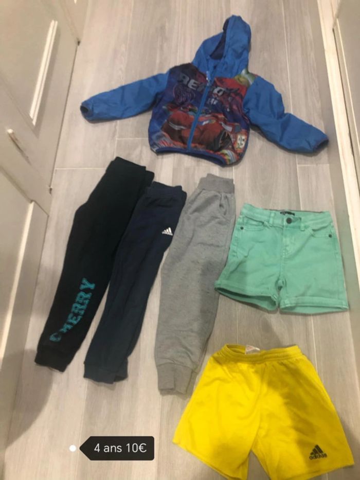 Une doudoune coupe vent cars intérieur polairez mini tache sur la manche pas visible 3 jogging dont deux avec mini trous au genoux adidas et 2 autres 1 short adidas jaune mini trou 1 tex en jeans vert stretch neuf