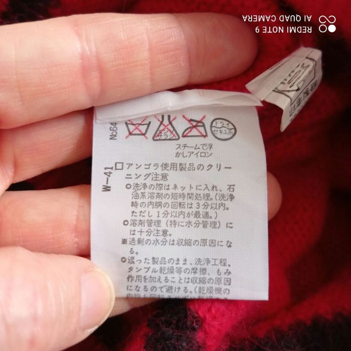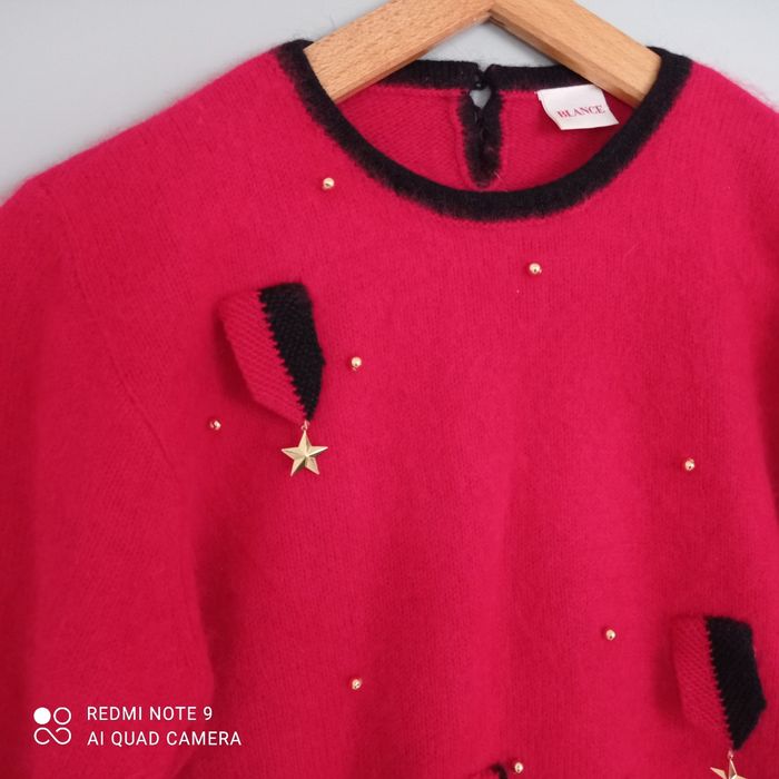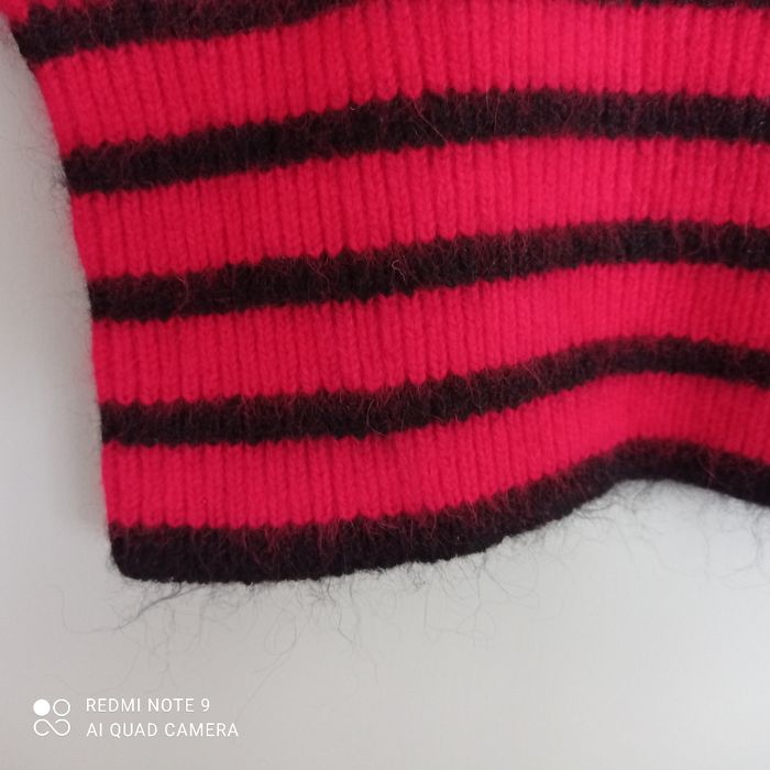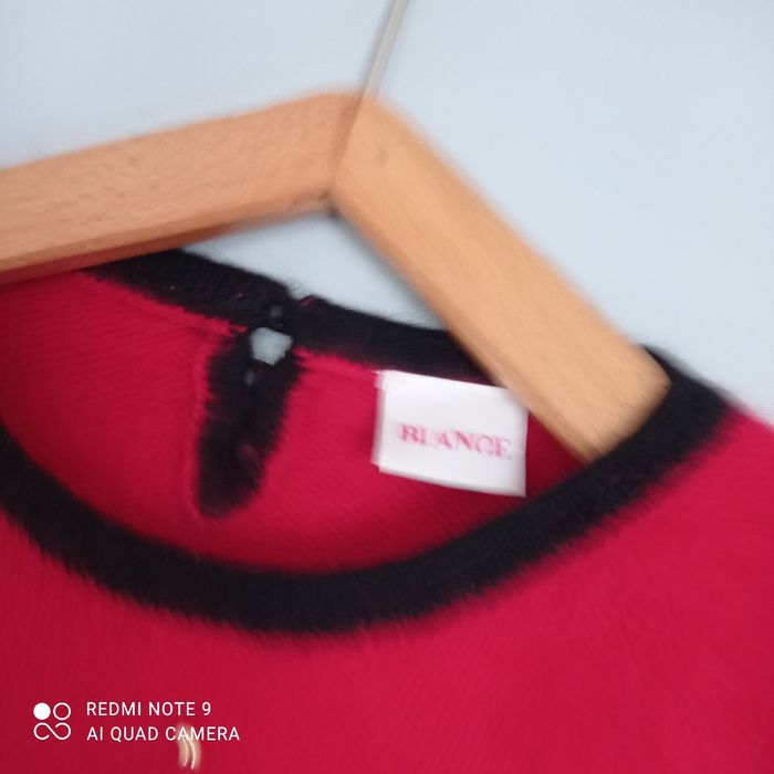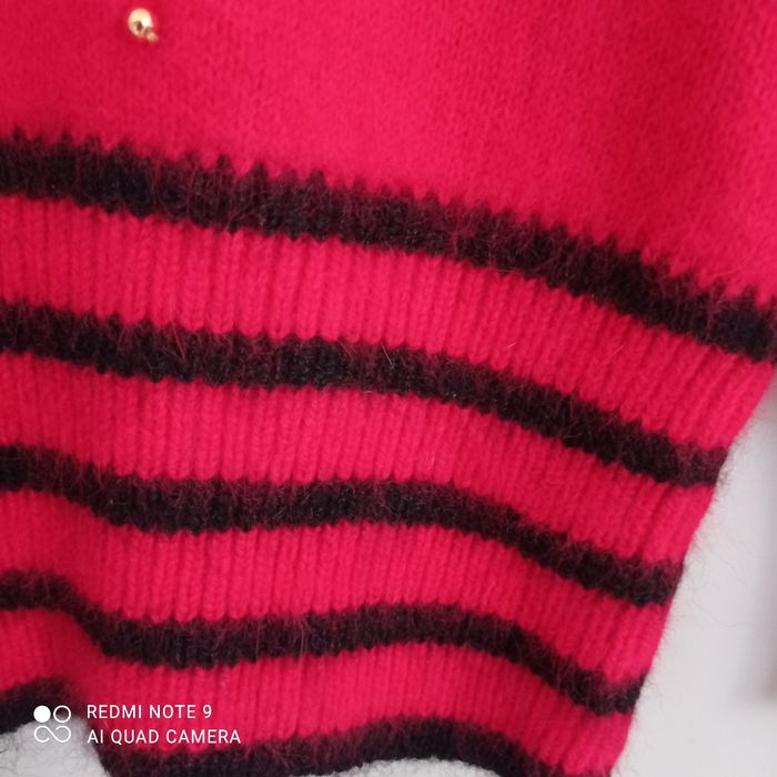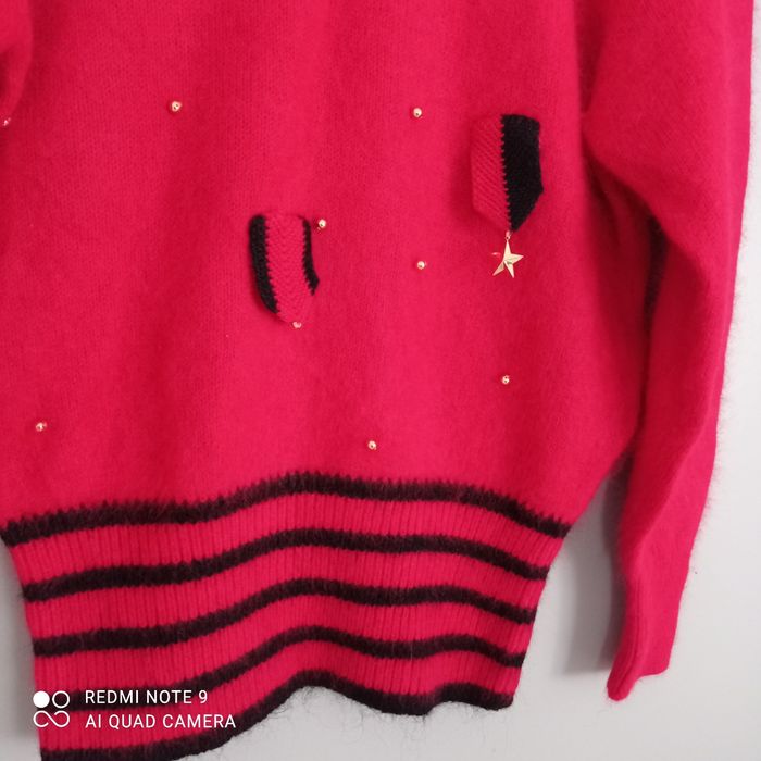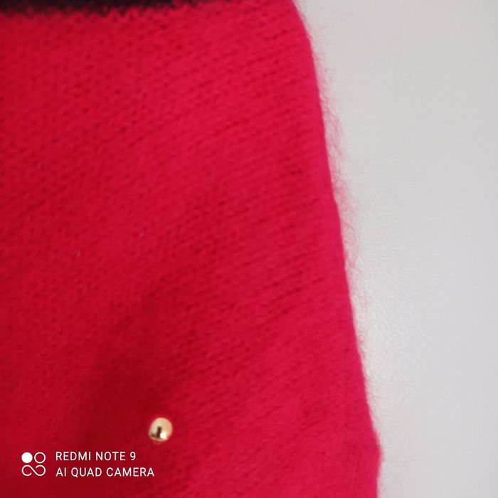 Je ne connais pas la matière car l étiquette de composition est écrite en langue asiatique. Je pense qu'il y a de l angora ou du mohair. Une breloque étoile manquante. Quelques rayures noires en bas. Voici les mesures prises à plat : épaules : 37 cm, aisselles : 49 cm, longueur : 59 cm.