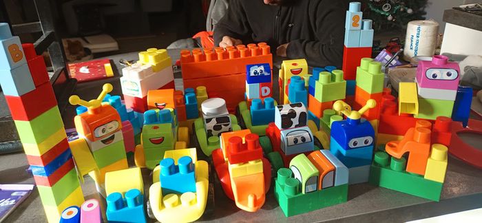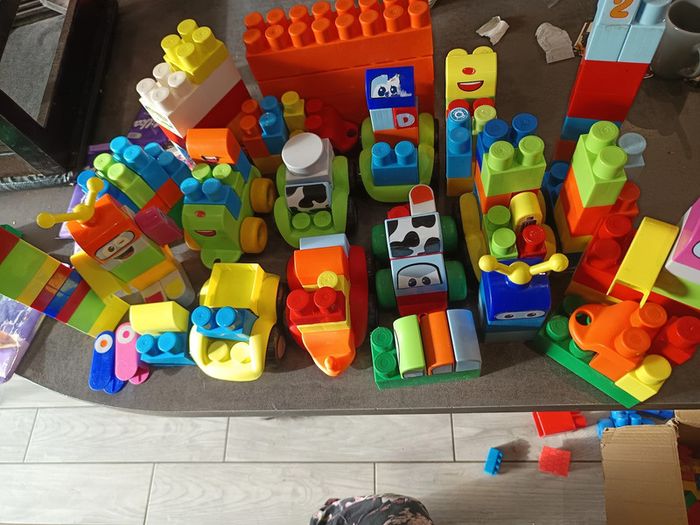 Gros lot construction abrick Bon état car certains autocollants sont abîmés Il y a des voitures , des robots, des gros blocs ...
