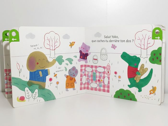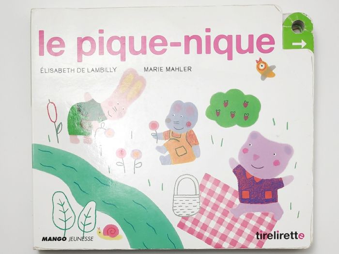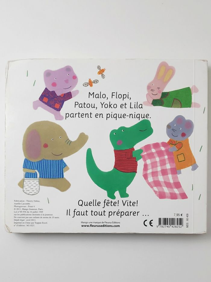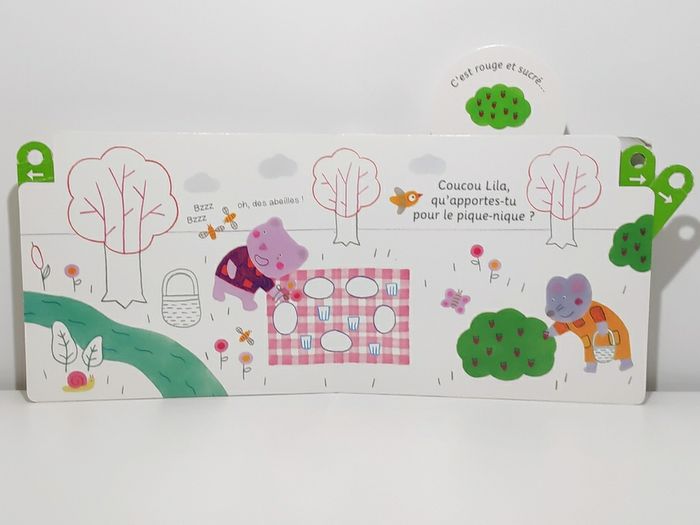 Livre cartonné de 10 pages Dimensions : 22 x 19 cm La tirette de la dernière page est manquante Aujourd'hui, il fait beau ! Malo et ses copains vont faire un pique-nique en forêt. Chacun apporte de quoi faire le meilleur goûter... Grâce aux indices donnés dans les tirettes, le lecteur va deviner peu à peu les éléments qui feront de ce pique-nique une vraie fête !