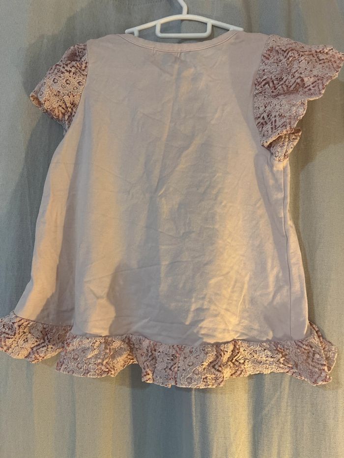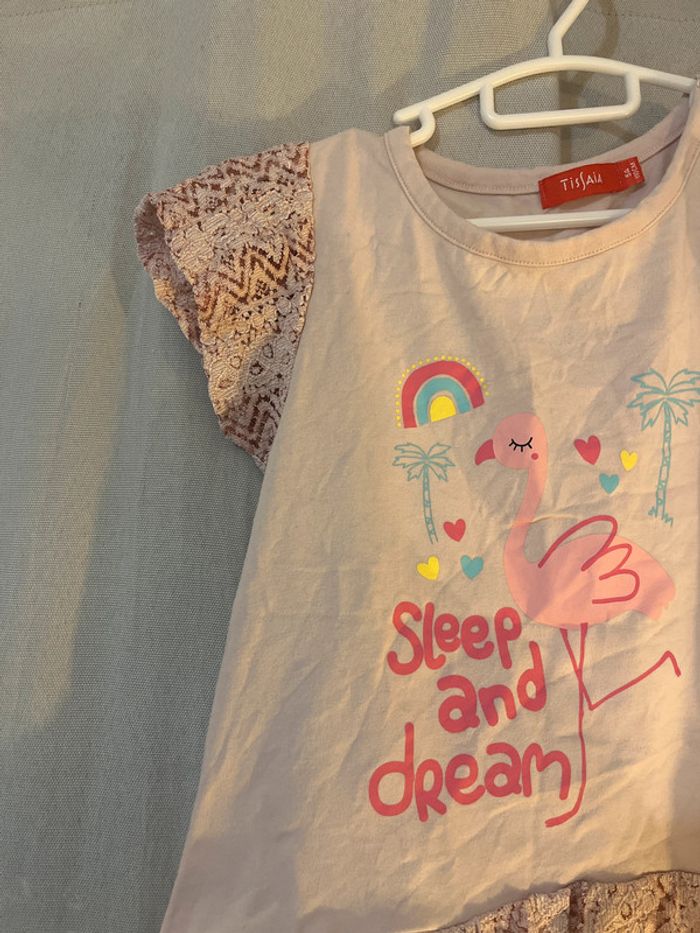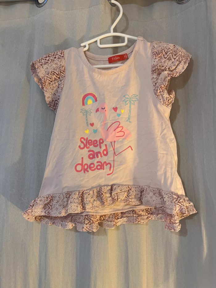 Tee-shirt rose avec dessin flamant rose. Dentelle sur les épaules et le bas du teeshirt