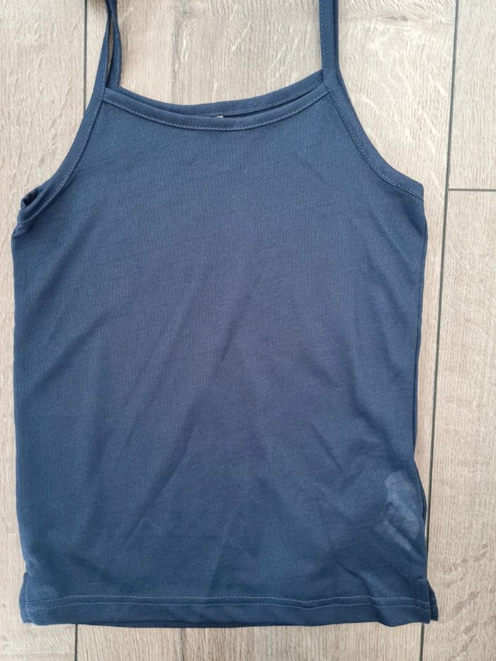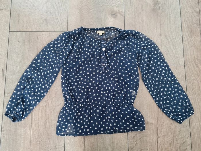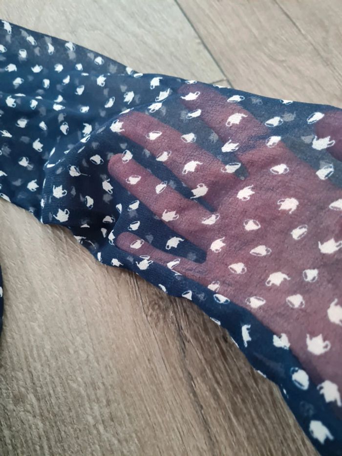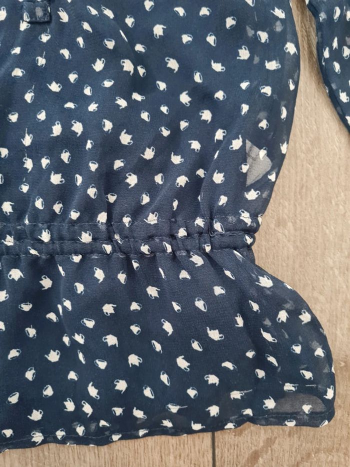 Tunique transparente, bleue marine et blanche. Fluide. Manches longues. Débardeur bleu marine en dessous, dissociable.
