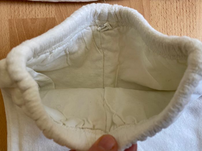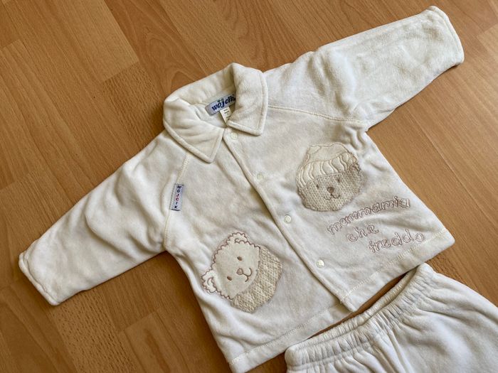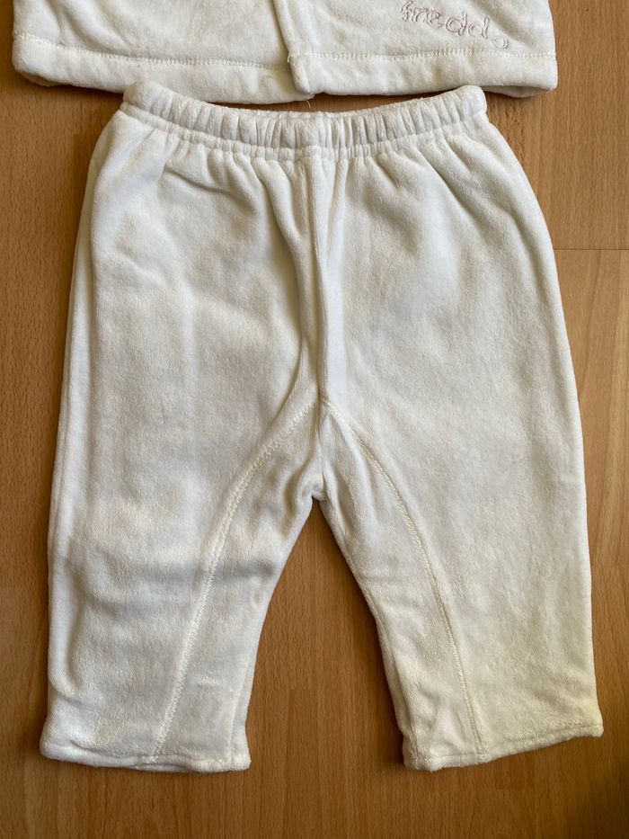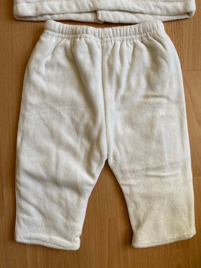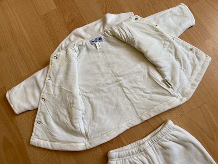 Bel ensemble en velours bien chaud couleur crème pour bébé garçon ou fille T. 6 mois/68 cm, en polyester entièrement doublé en coton, en très bon état. Veste avec fermeture par boutons pression, pantalon avec taille entièrement elastiquée.