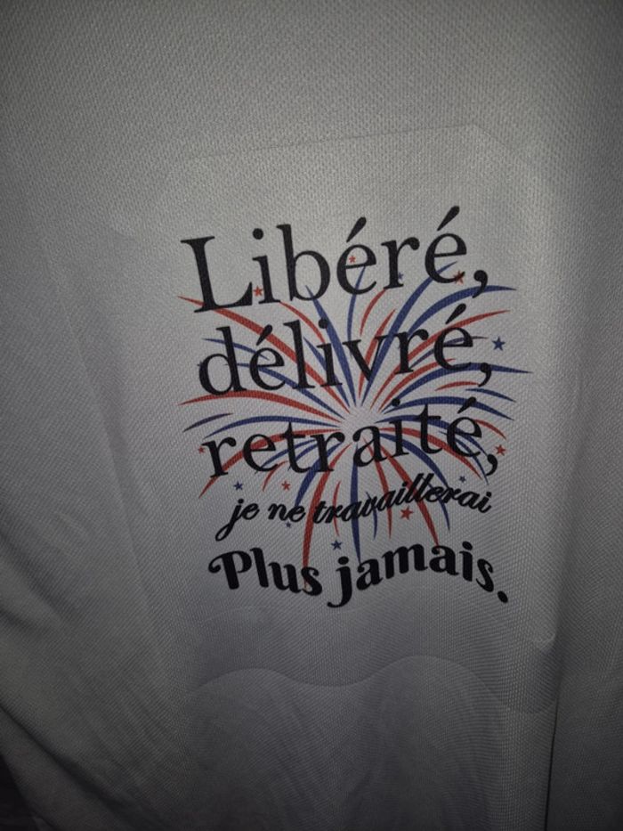 t-shirt humour libéré, délivré, retraité, je ne travaillerai plus jamais. 100% polyester neuf jamais portais. différentes taille disponibles. Dispo également en blanc.