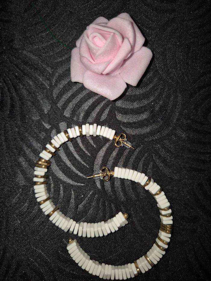 Boucles d'oreilles créoles - Perles Heishi - Bohm Paris 11€ Boucles d'oreilles créoles en acier inoxydable orné de pierres naturelles Heishi teintées. Inspiré de la culture surf, ces boucles sont parfaites pour un look estival décontracté. Différent colories, 5cm de diamètre extérieur. vendu dans pochette organza