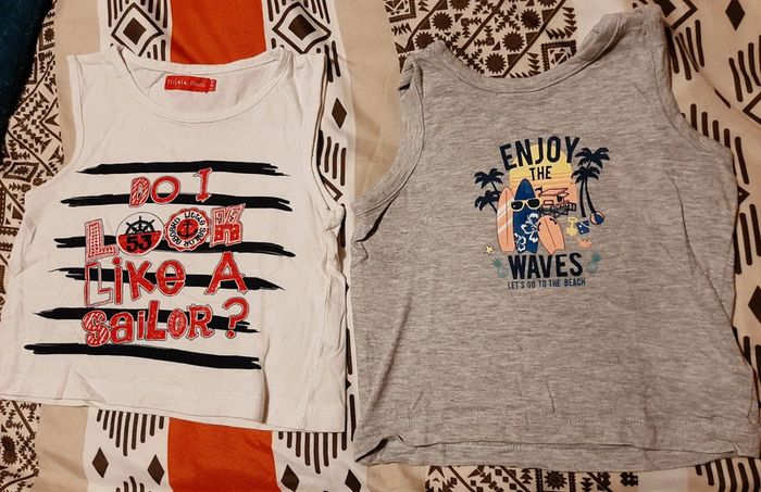 Lot de 2 débardeurs/ Marcels taille 24mois pour l'un est 3 ans pour l'autre mais taille correspondante à du 24mois. Très bon état. Marque mots d'enfants et tissaïa. N'hésitez pas à aller faire un tour dans mon dressing de nombreux autres articles à vendre à des tout petits prix et prix dégressif sur les lots 🙂🌸je reste disponible pour toutes questions.