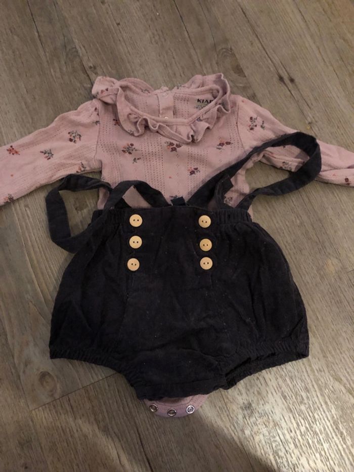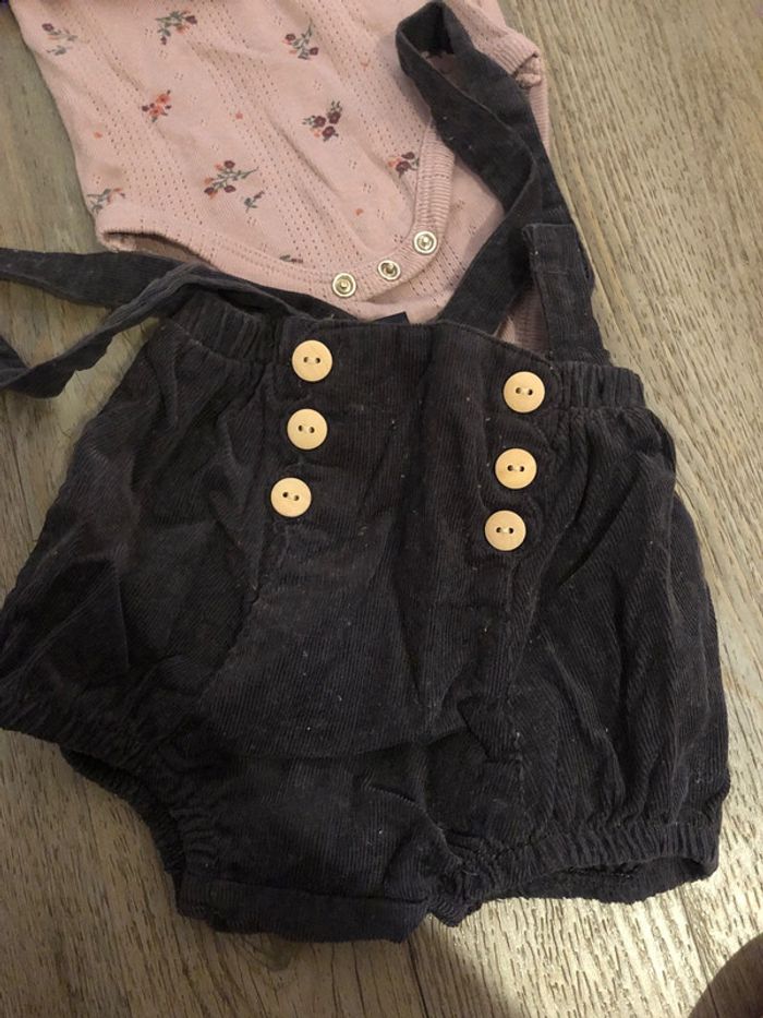 Très bel ensemble pour bébé fille 3 mois salopette Bas un tout petit peu boulocher mais vraiment un peu et haut en très bon état