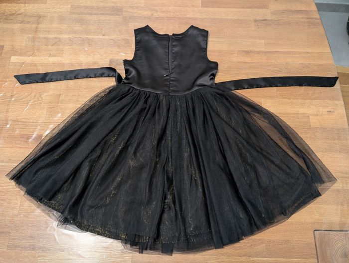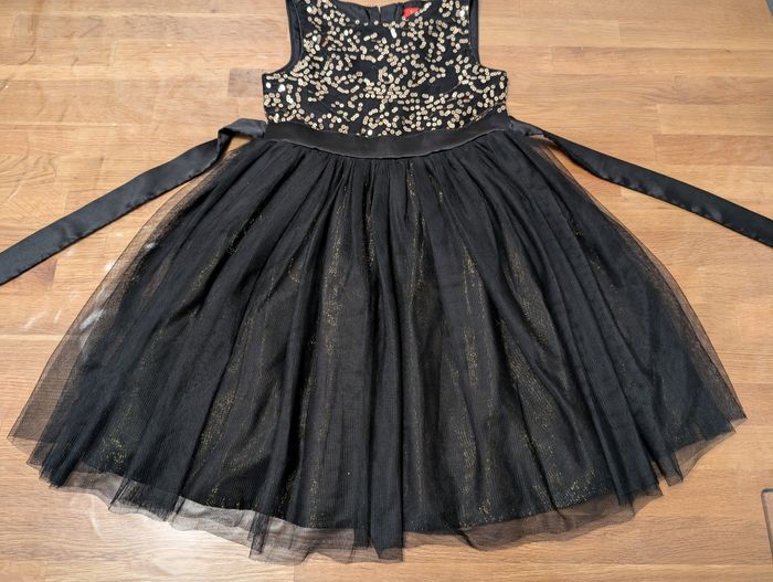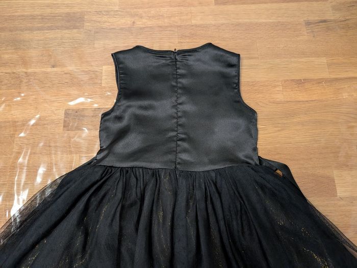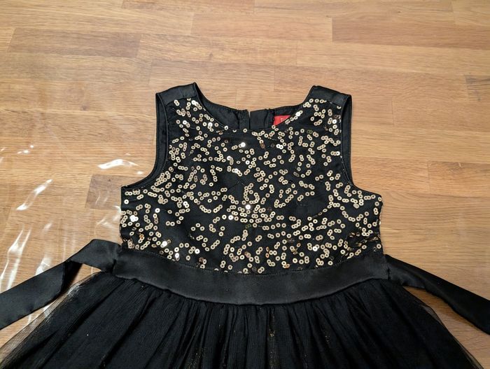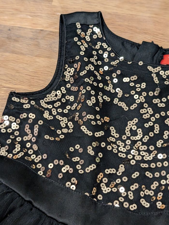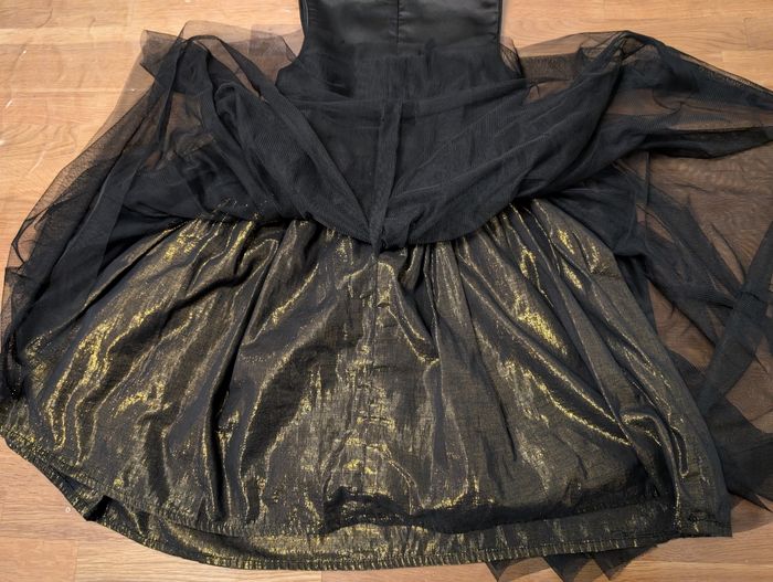 Robe de fête fille 5 ans Tissaia Bon état, noir et doré, il y a certains fils défaits au niveau des sequins, un défaut sur le tulle et la fermeture éclair ne descend pas jusqu'en bas, s'arrête au niveau de la taille.