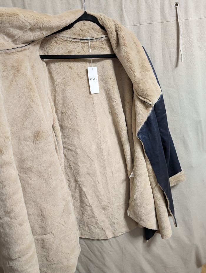 Veste bleue marine et fourrure beige ultra douce avec 2 poches plaquées Taille 44 Jamais portée