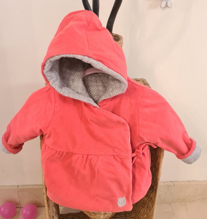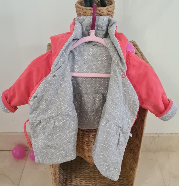 Veste réversible avec capuche "Obaïbi" bien chaud Pression et petit lien Corail et gris Taille 3 mois En très bon état