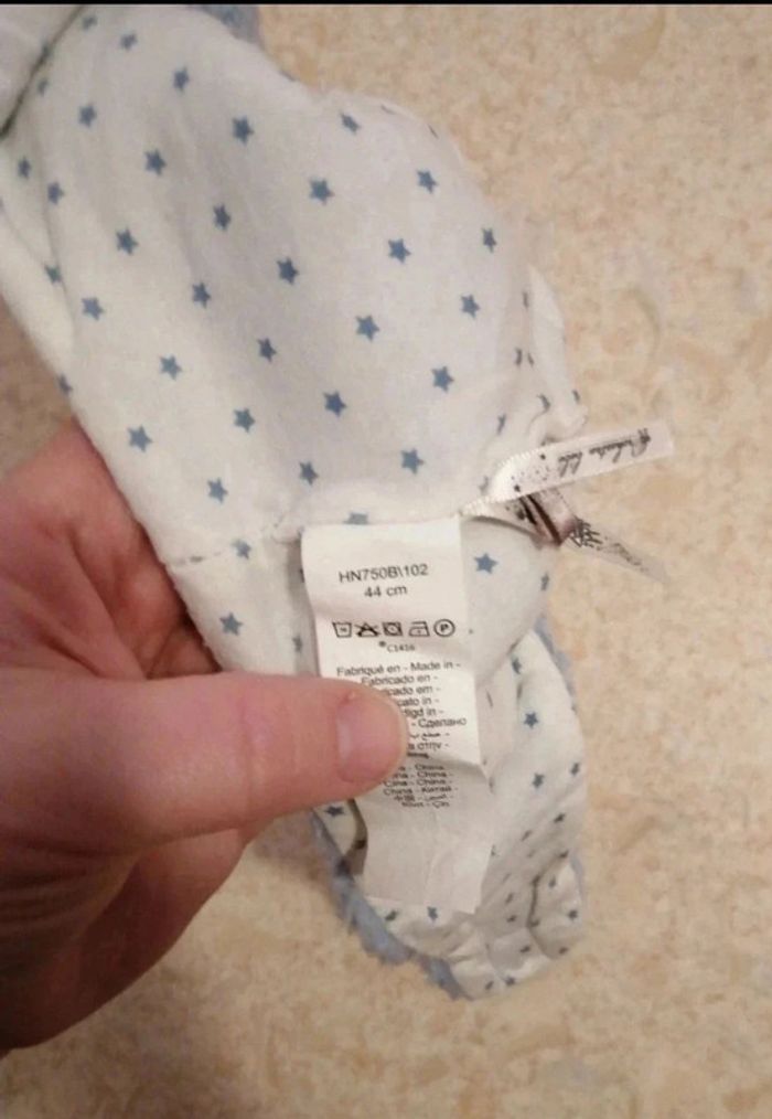 Bonnet en très bon état. Visage de chat. Se ferme avec un scratch. Mon fils a pu même le porter encore à 9 mois. Orchestra. 44cm.