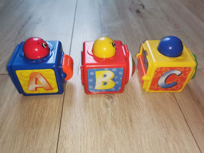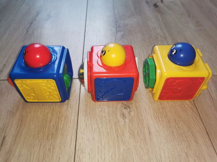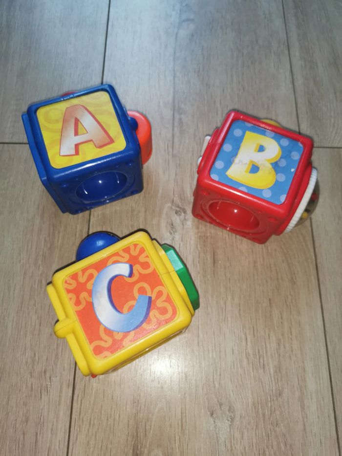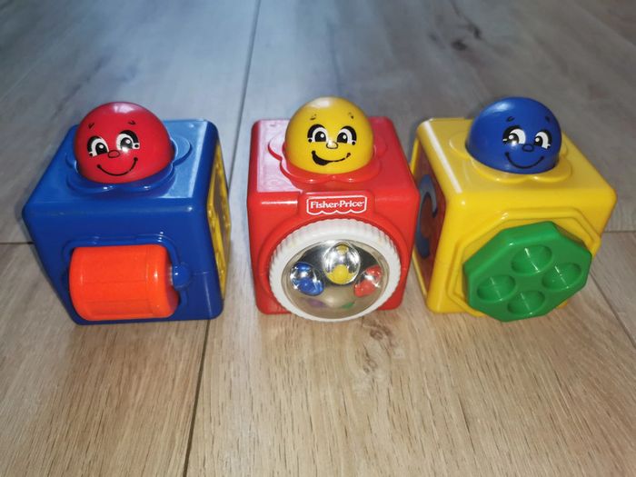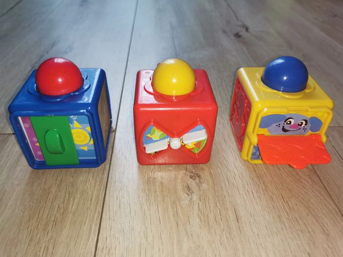 Trois cubes colorés à empiler de marque Fisher Price proposant plusieurs activités :