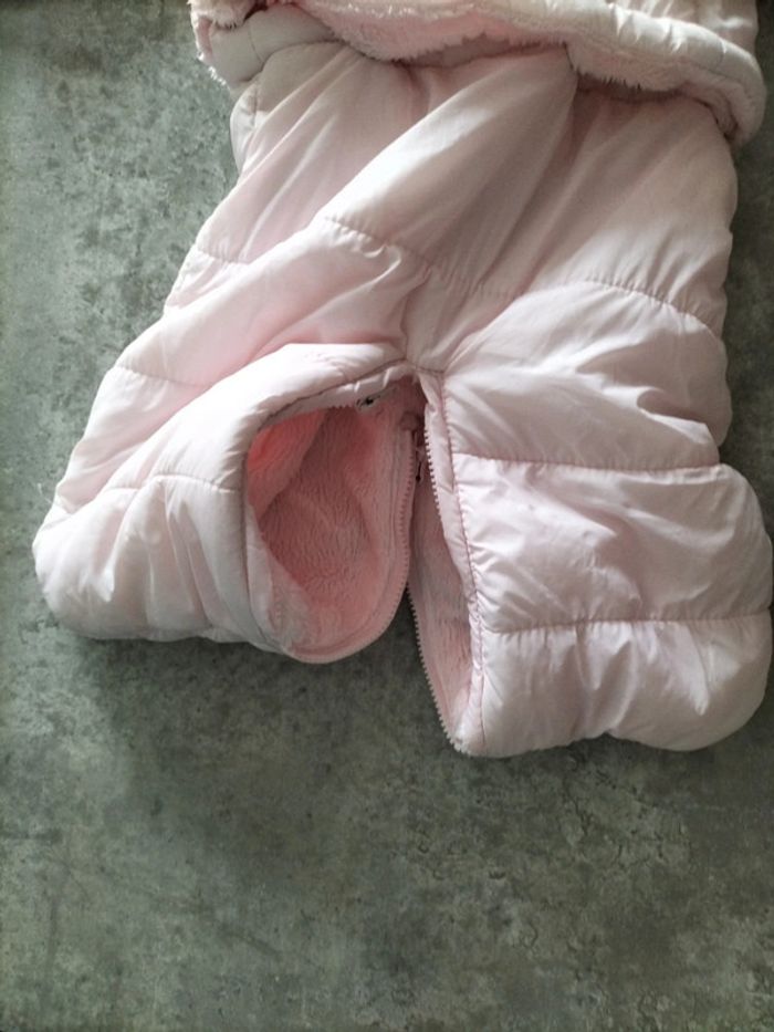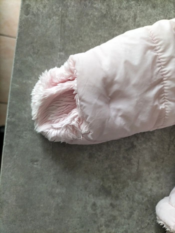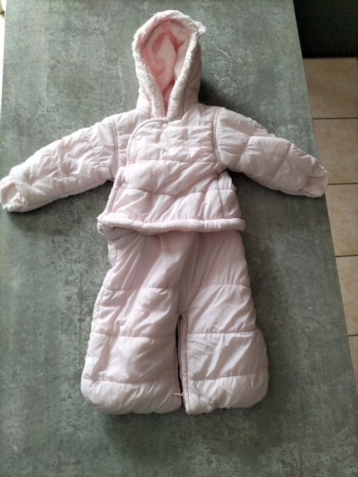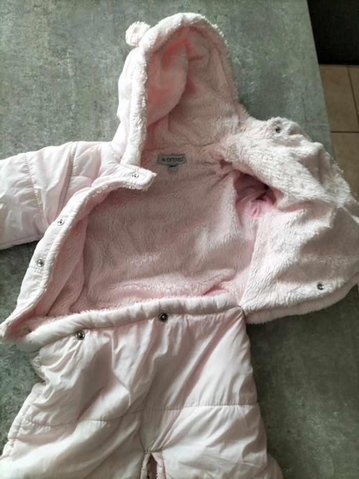 Très jolie combinaison rose avec capuche matelassée de moumoute toute douce. Des pressions pour attacher le pantalon.des moufles attachés au bas des bras. Peu portée #fanfanfille3mois@fanfan35320