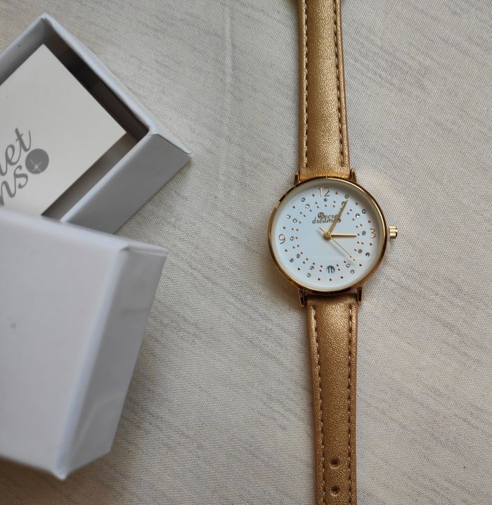 NEUF : Montre Secret Dreams bracelet doré éclat de diamant Cadeau idéal pour Saint Valentin ou fête des mères ! Je propose les livraisons via Relais Colis & Shop2shop by Chronopost car Mondial Relay n'est pas fiable : Il arrive parfois que Mondial Relay ne livre pas au relais choisi lors de la commande, puis renvoie le colis à l'expéditeur. Réductions qui s'appliquent automatiquement (sans code donc cumulables avec les codes promo de Beebs): - 20% dès 15 articles achetés - 15% pour 10 articles achetés -10% pour 5 articles achetés - 5% pour l'achat de 2 articles. 1 lot / 1 annonce compte pour 1 article.